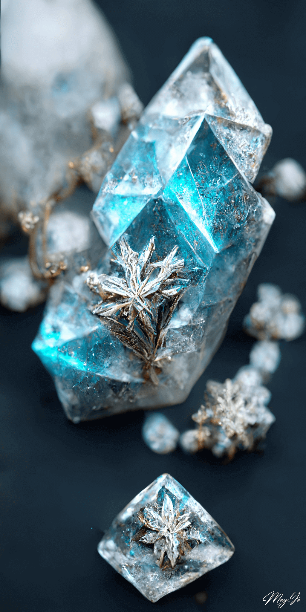 「六つの花」とも呼ばれる雪の結晶からできた、架空のクリスタル・ジュエリーをイメージしたイラストを作成しました。冷たそうな空気のなかにきらめく青白い輝きと、氷のような霜のようなジェムが幻想的な雰囲気に。