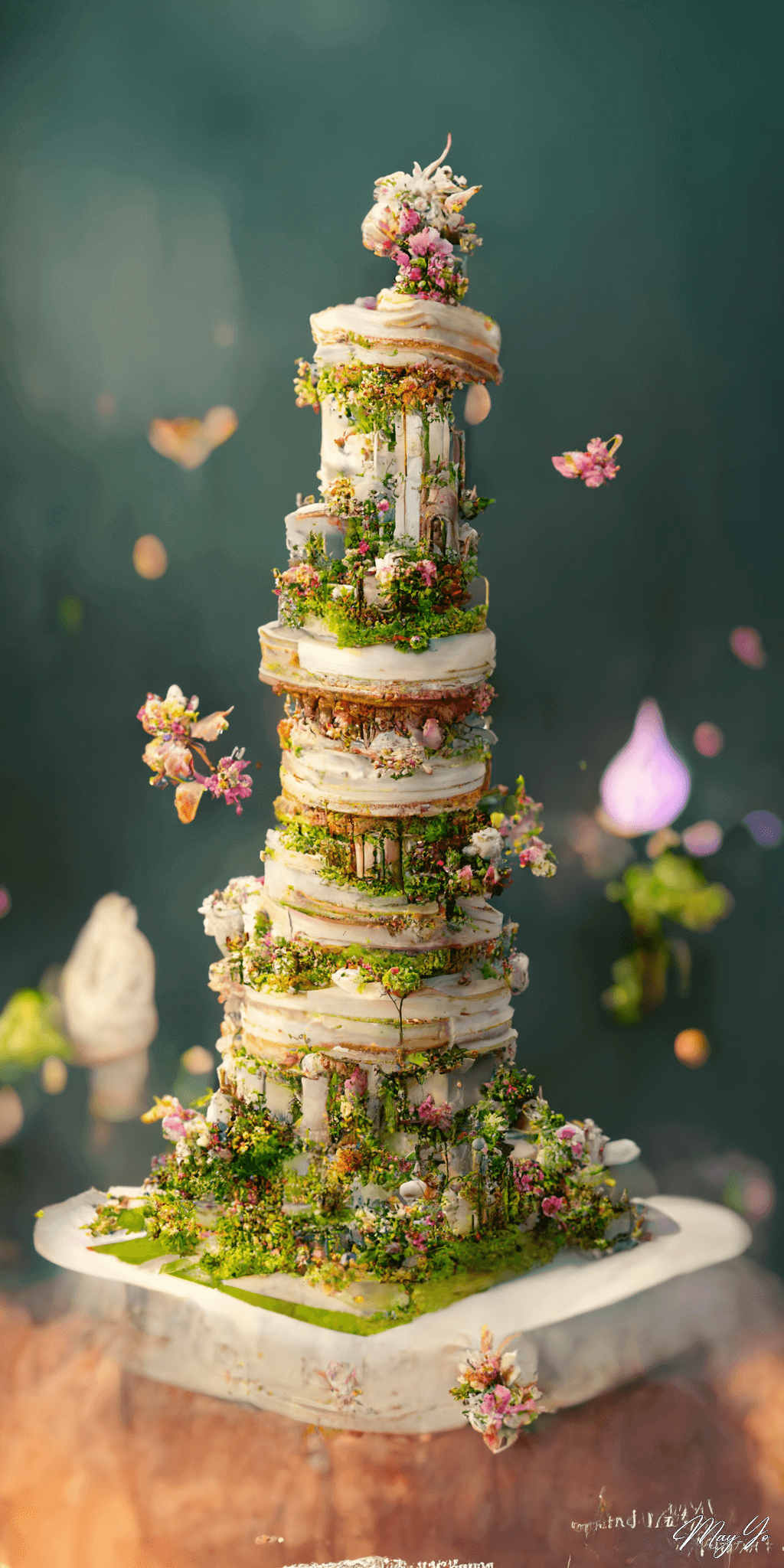 ウェディングケーキでできた不思議なタワーの壁紙イラスト ガーデンウェディングパーティーの塔のイメージの待受 AIイラスト待受 縦長画像 garden wedding party tower illustration wedding cake tower fiction art