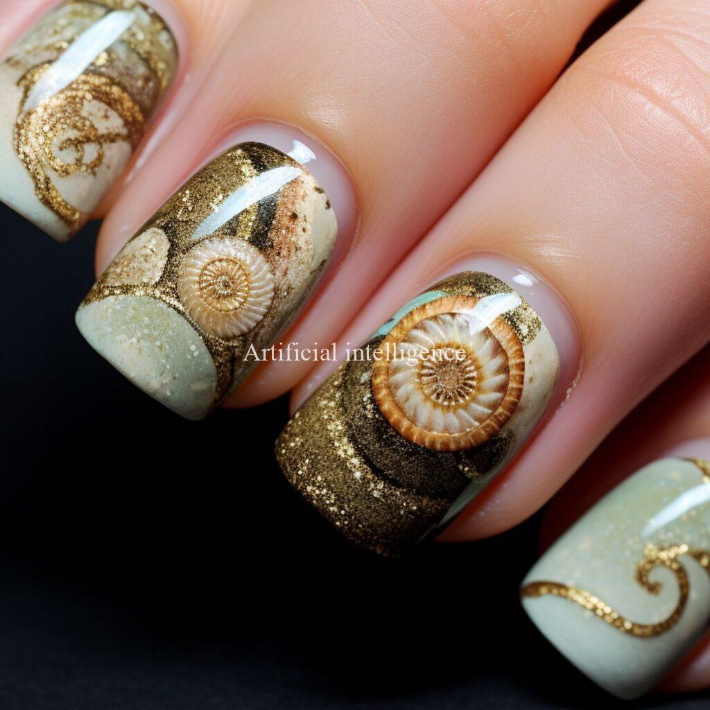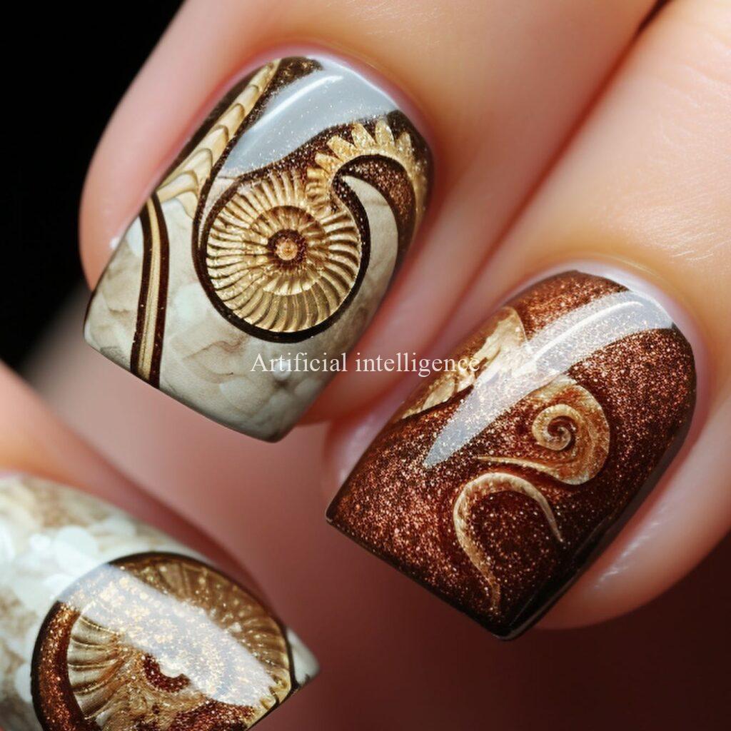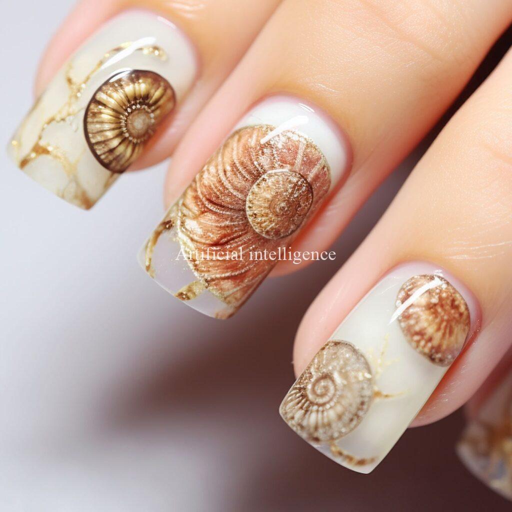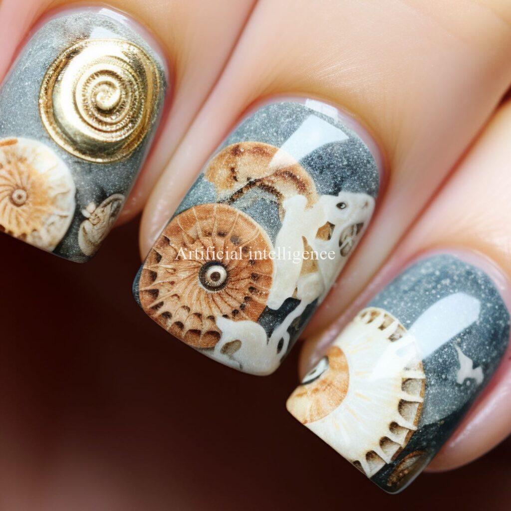 アンティークなアンモナイト風ネイルをコンセプトにAIイラストツールで架空の画像を生成しました。