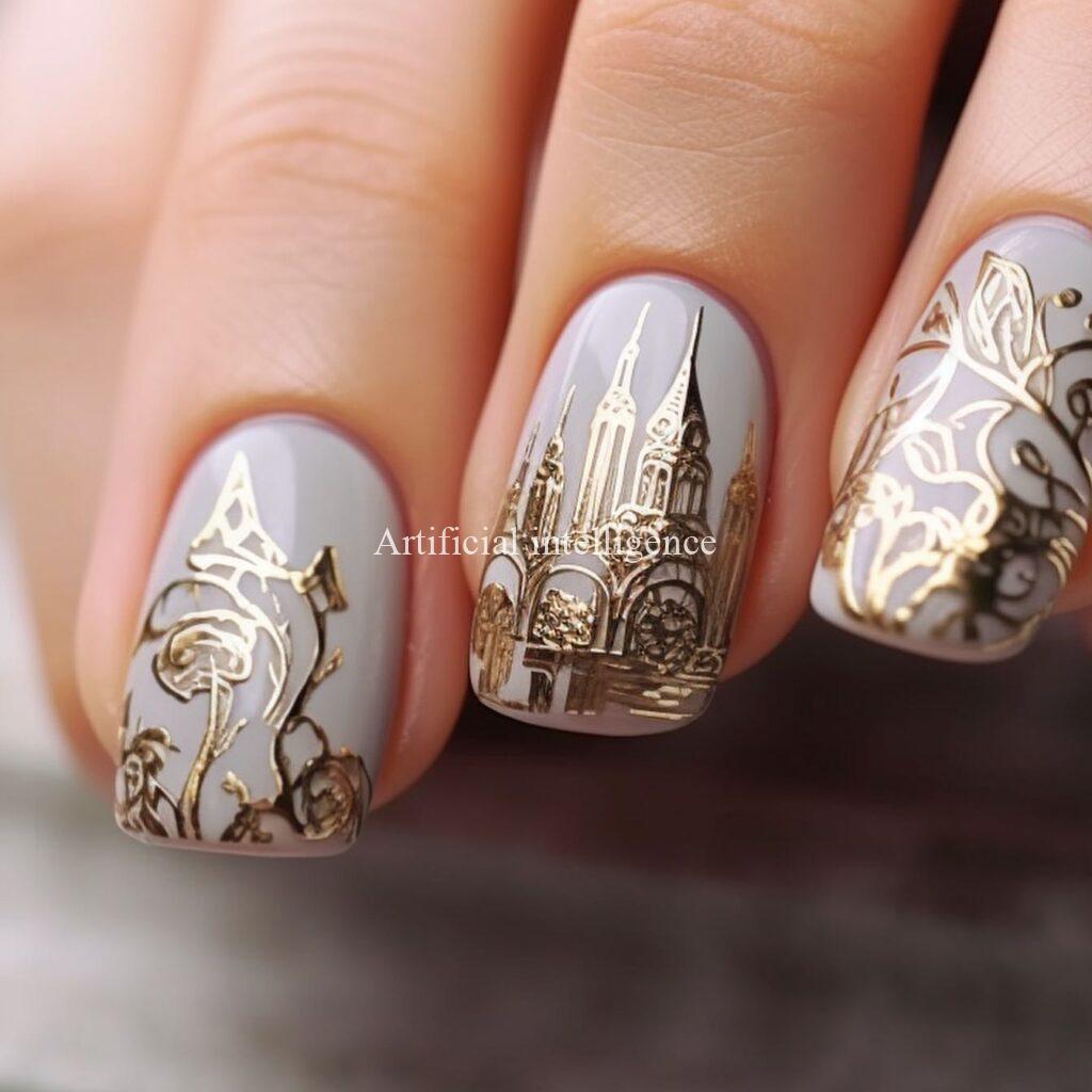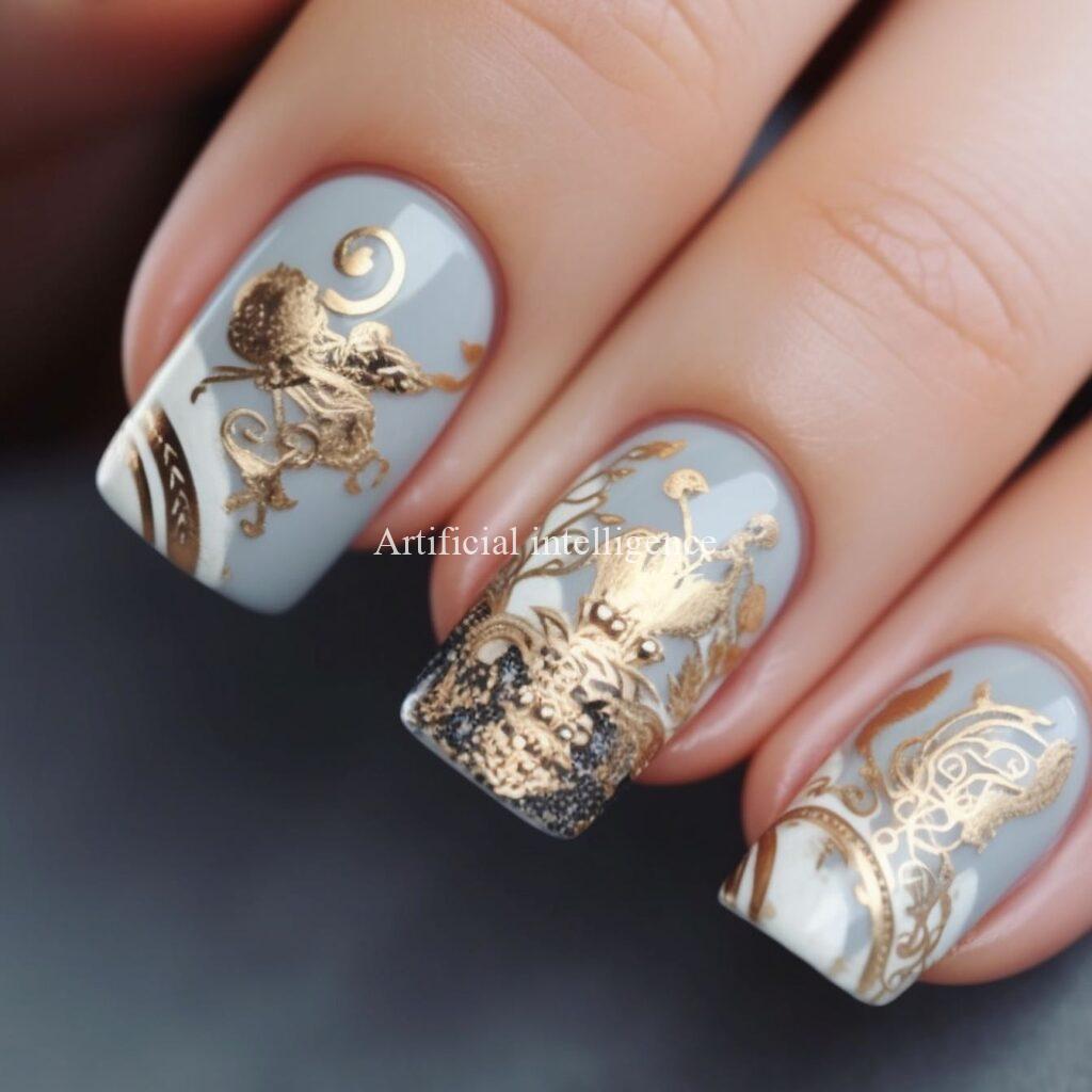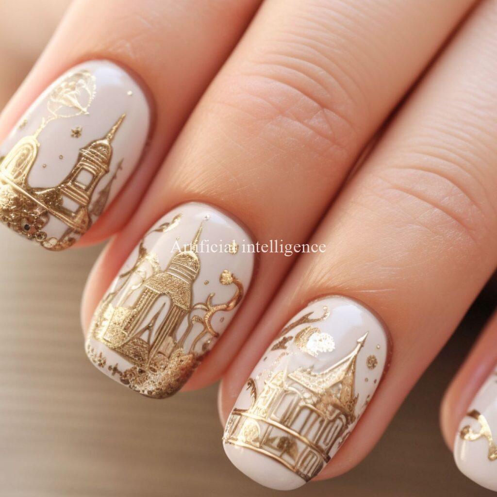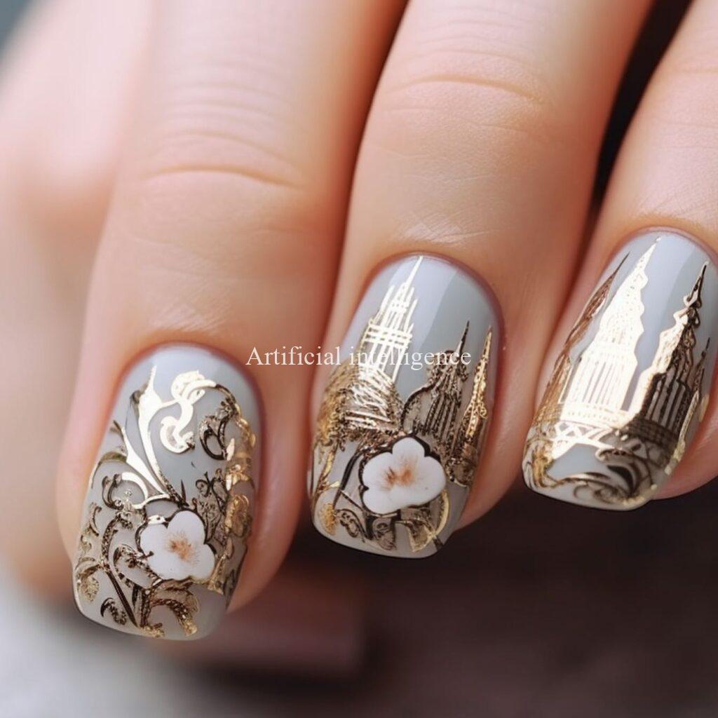 箔押し風ゴールドネイルをコンセプトにAIイラストツールで架空の画像を生成しました。