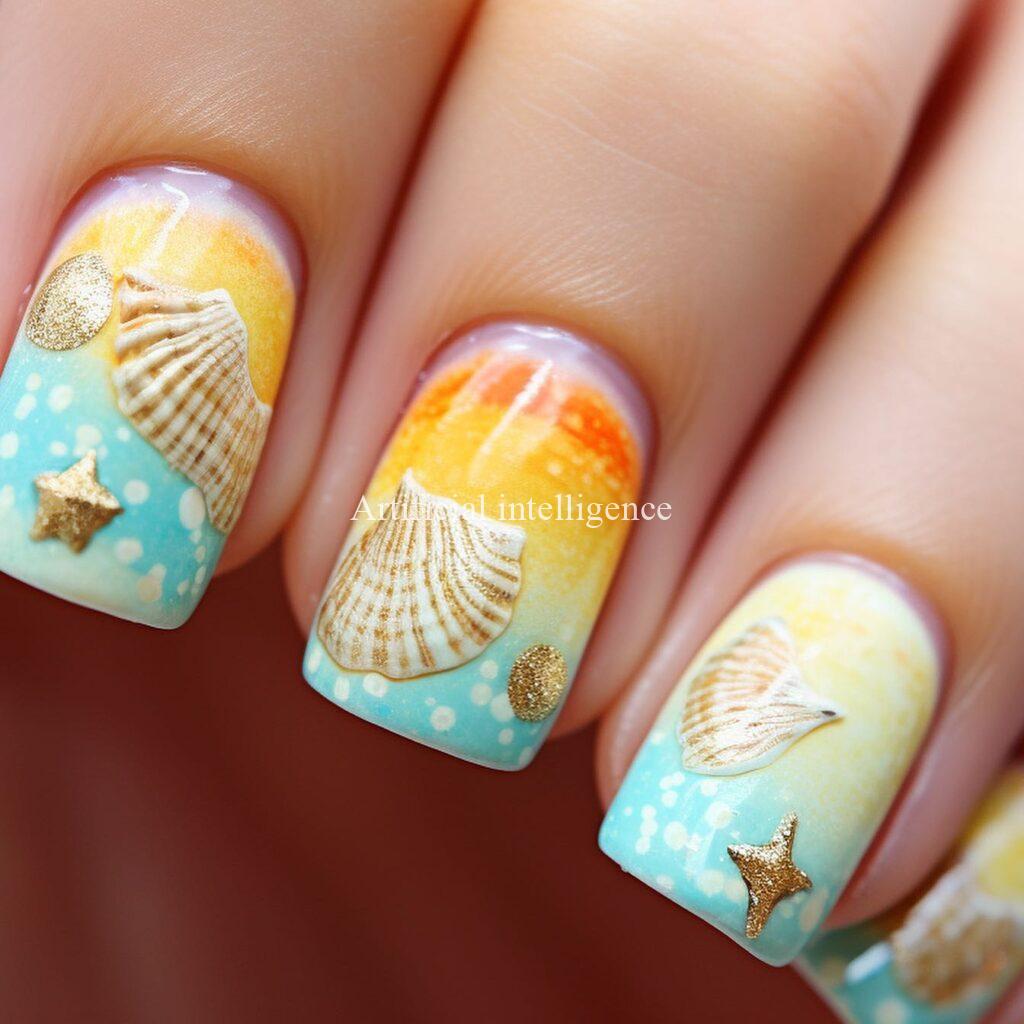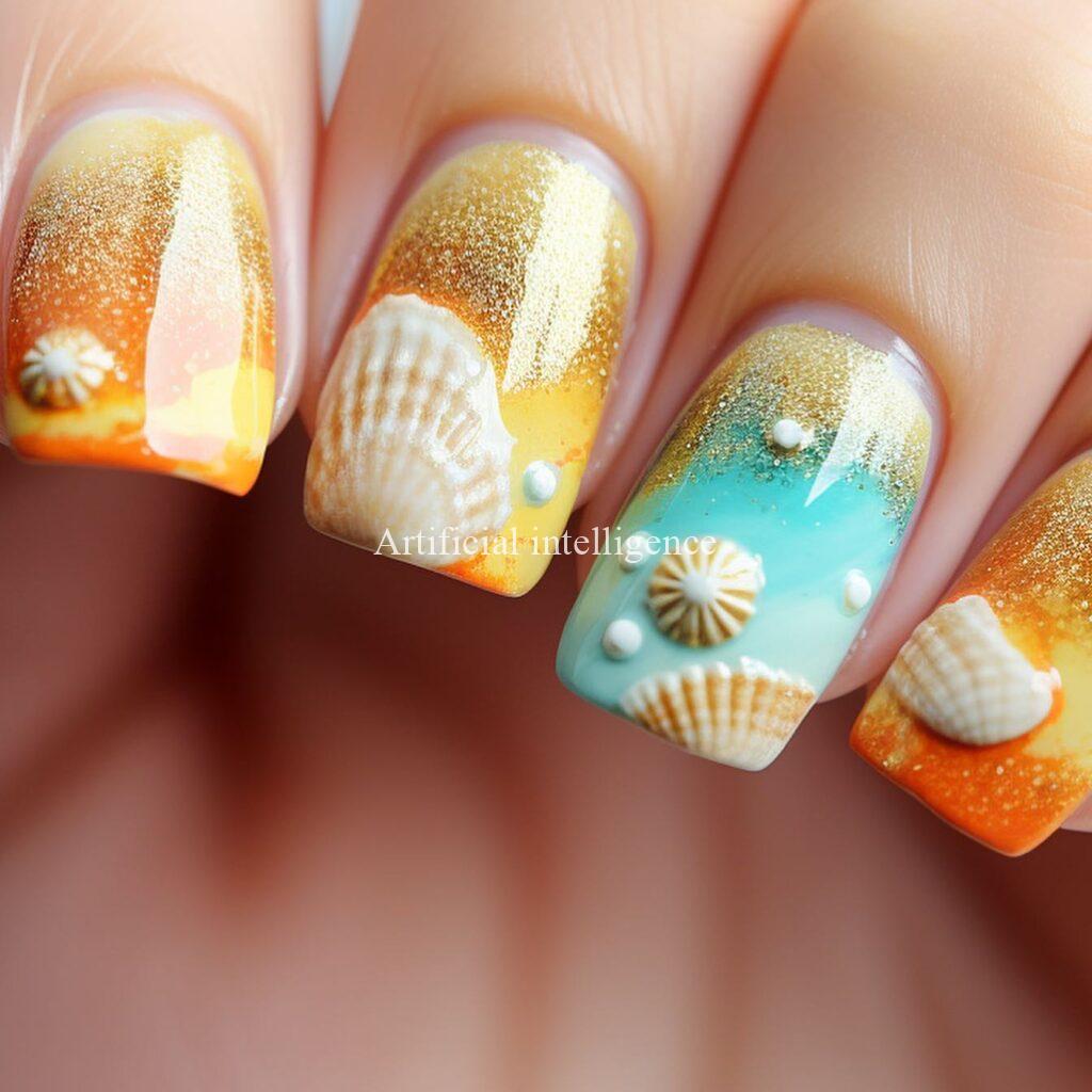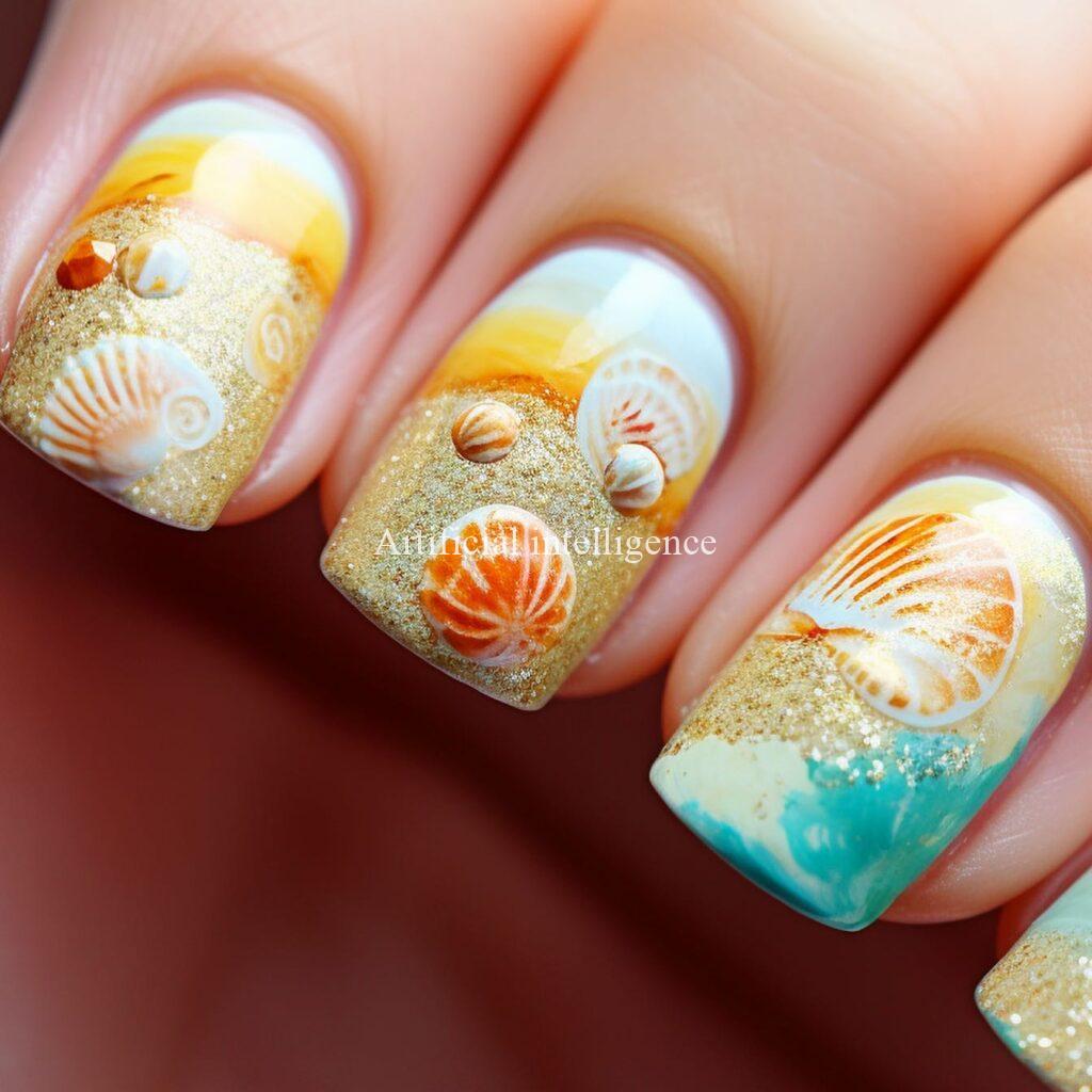 夏の砂浜貝殻ネイルをコンセプトにAIイラストツールで架空の画像を生成しました。