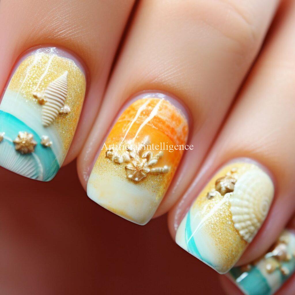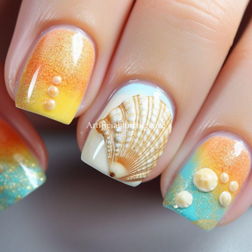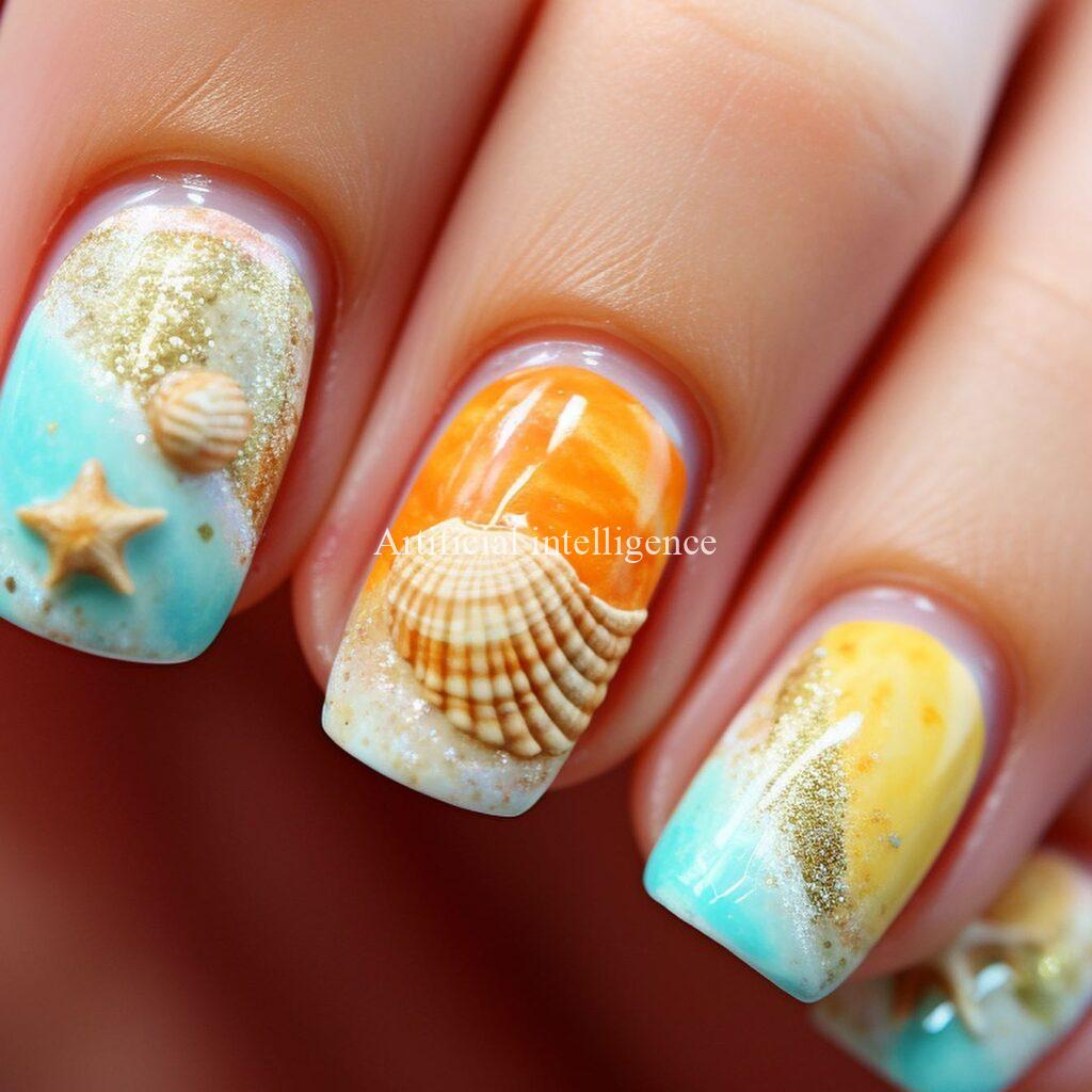 夏の砂浜貝殻ネイルをコンセプトにAIイラストツールで架空の画像を生成しました。