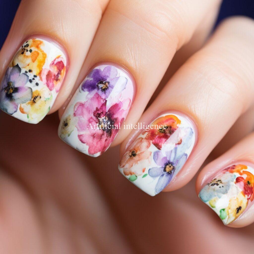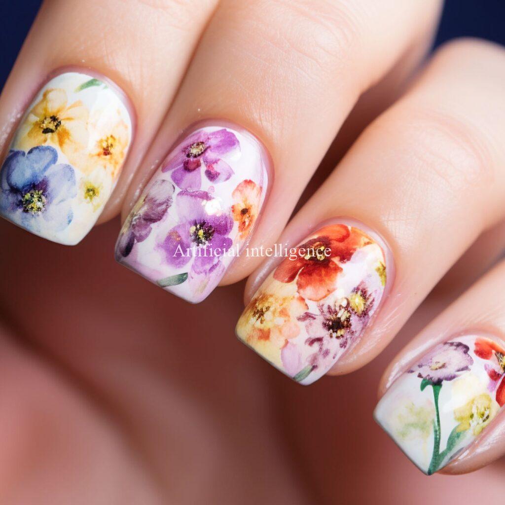水彩フラワーネイルをコンセプトにAIイラストツールで架空の画像を生成しました。