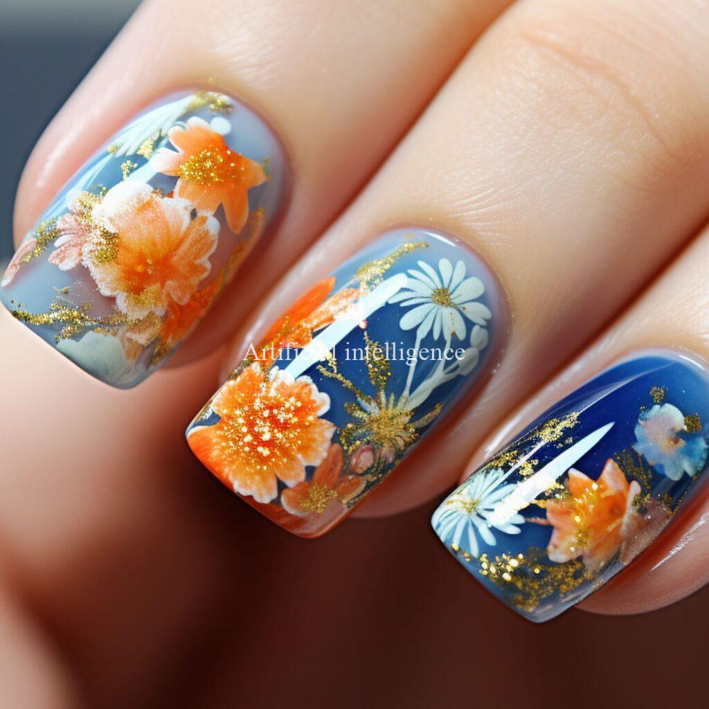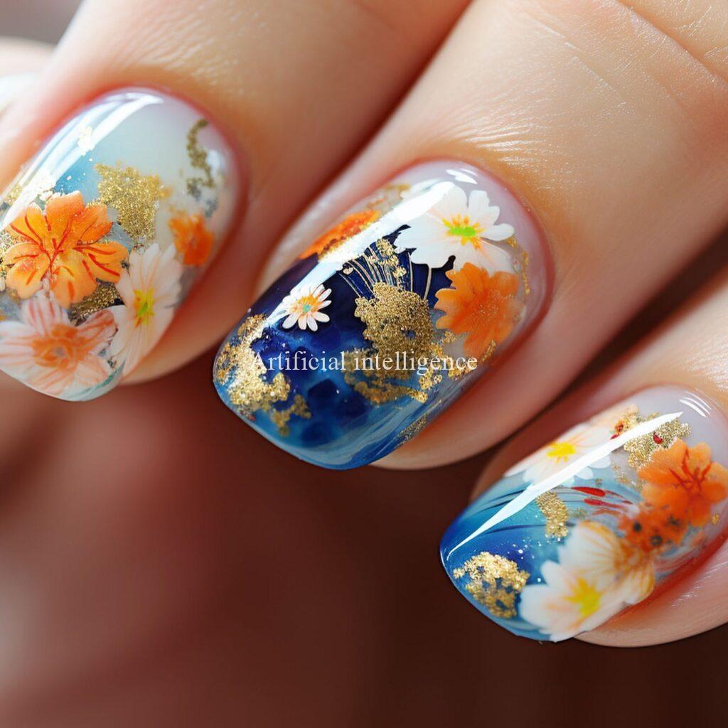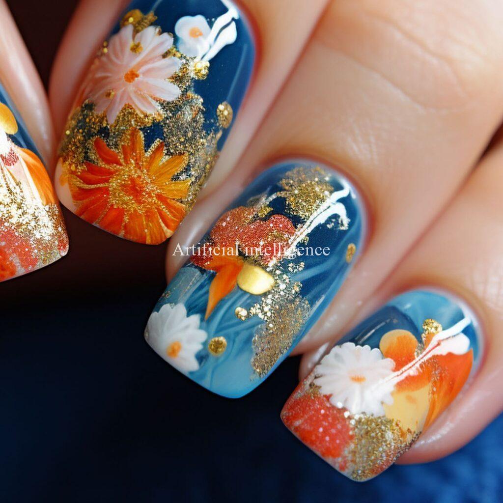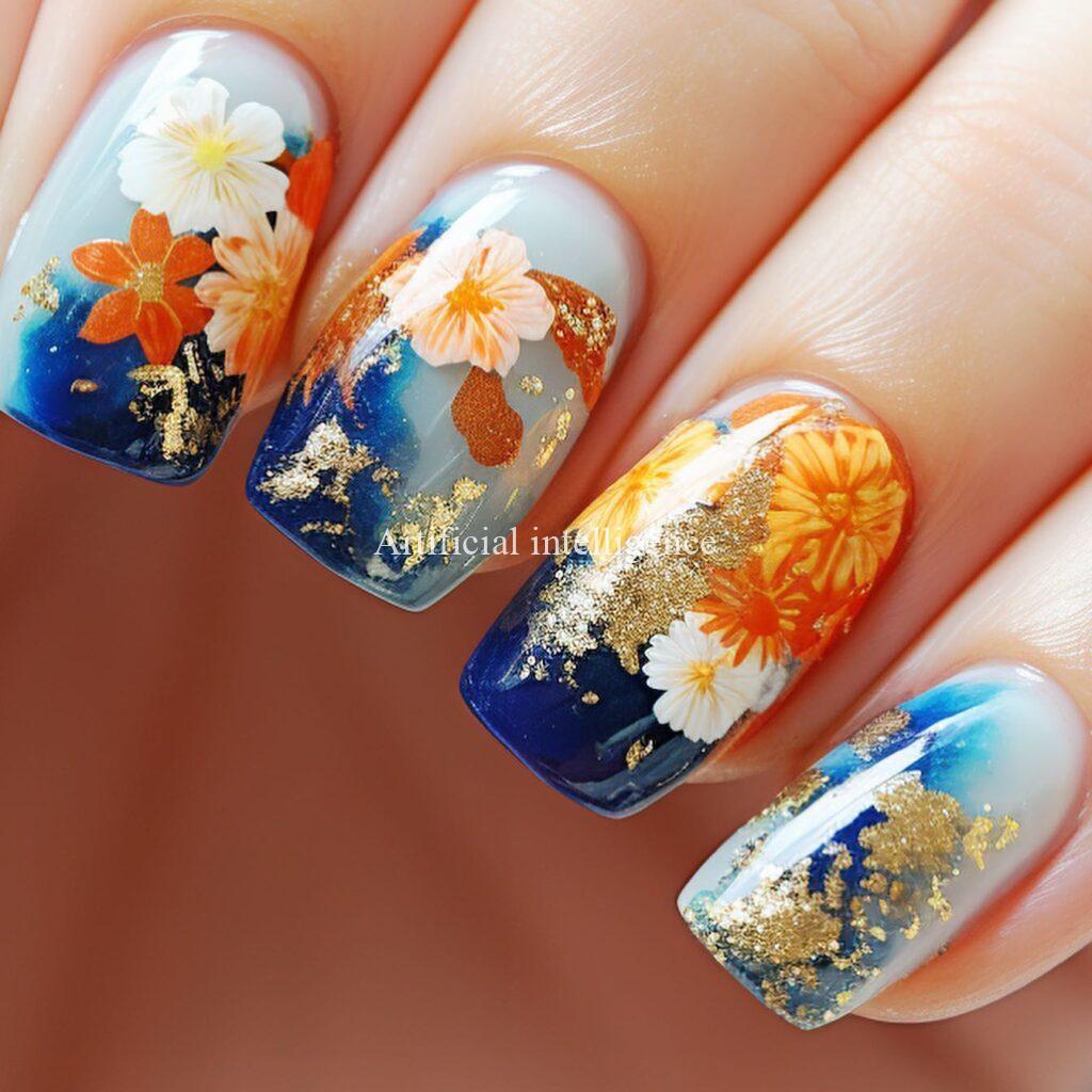 青と橙色の和モダンネイルをコンセプトにAIイラストツールで架空の画像を生成しました。