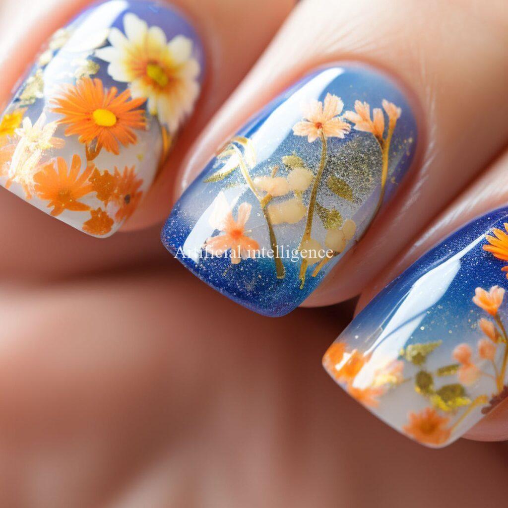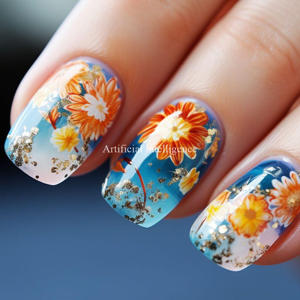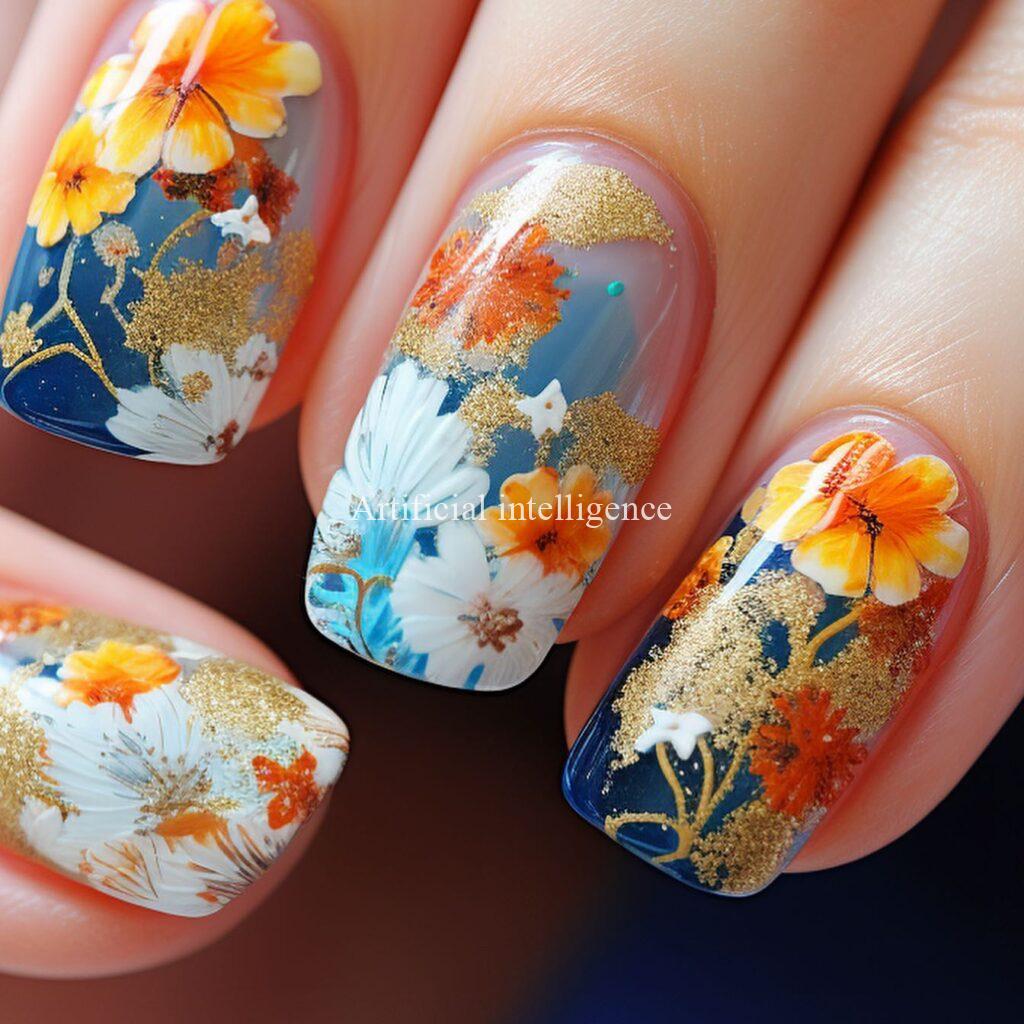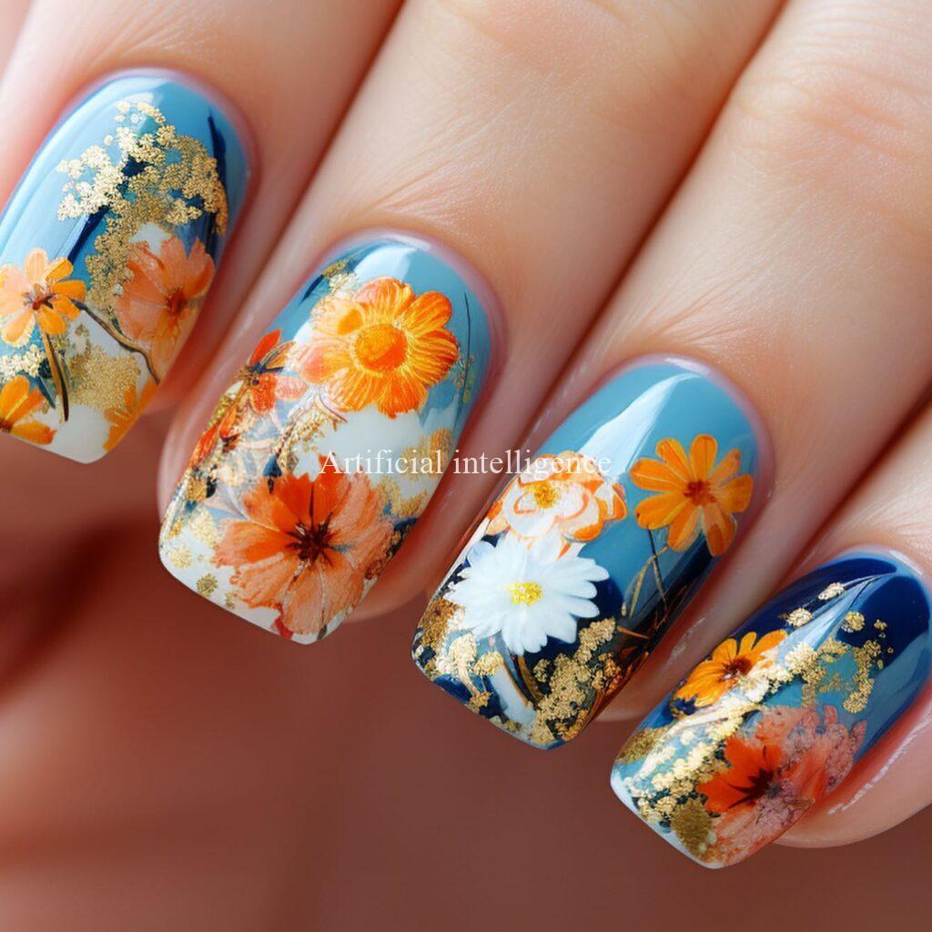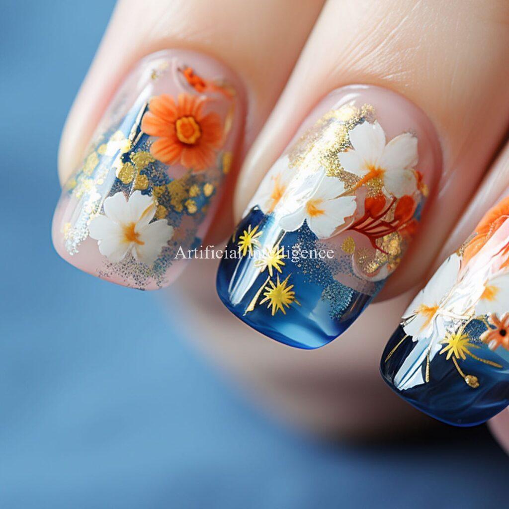 青と橙色の和モダンネイルをコンセプトにAIイラストツールで架空の画像を生成しました。