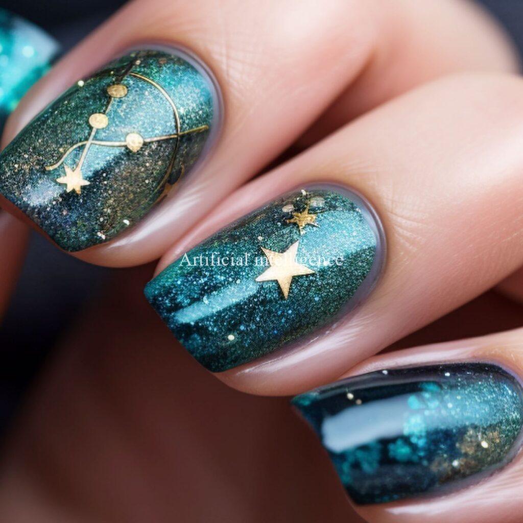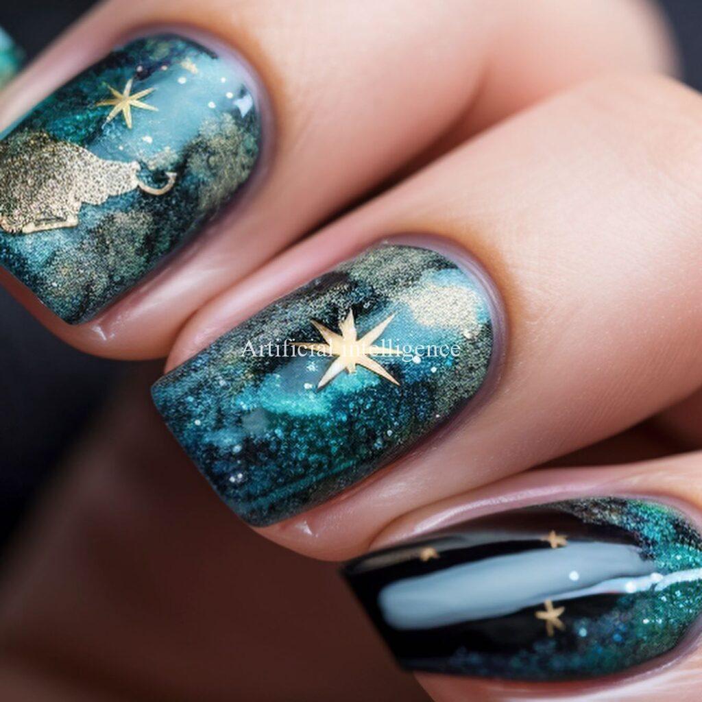 ダークターコイズブルーの夜空ネイルをコンセプトにAIイラストツールで架空の画像を生成しました。