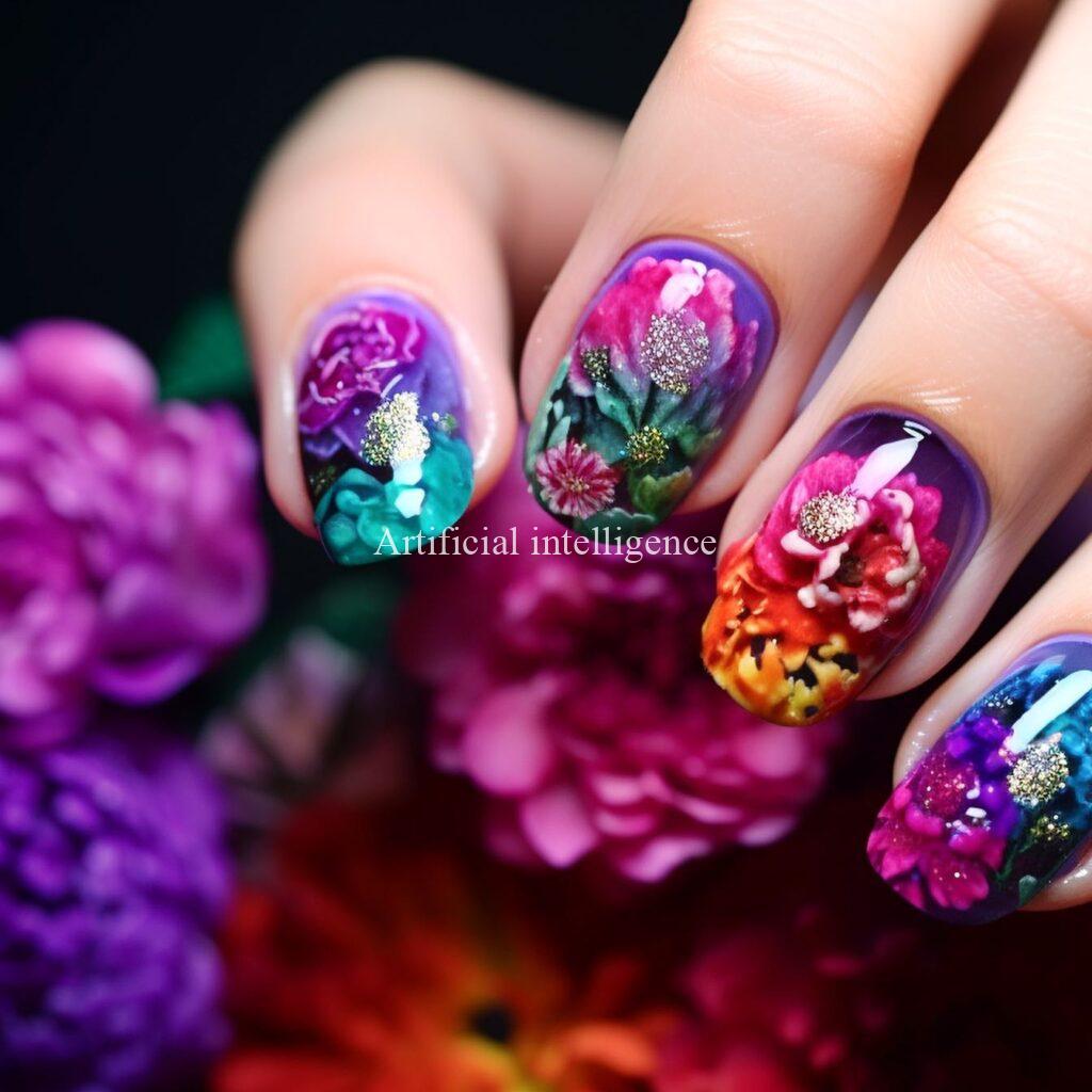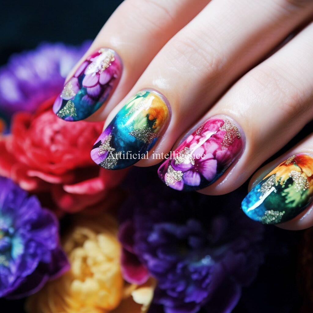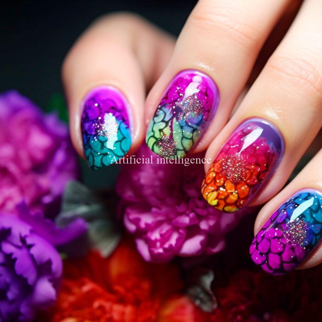 虹のアーティフィシャルフラワーネイルをコンセプトにAIイラストツールで架空の画像を生成しました。