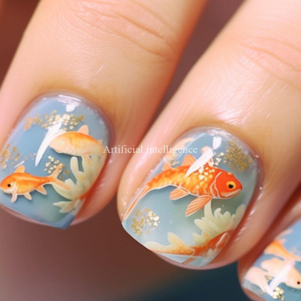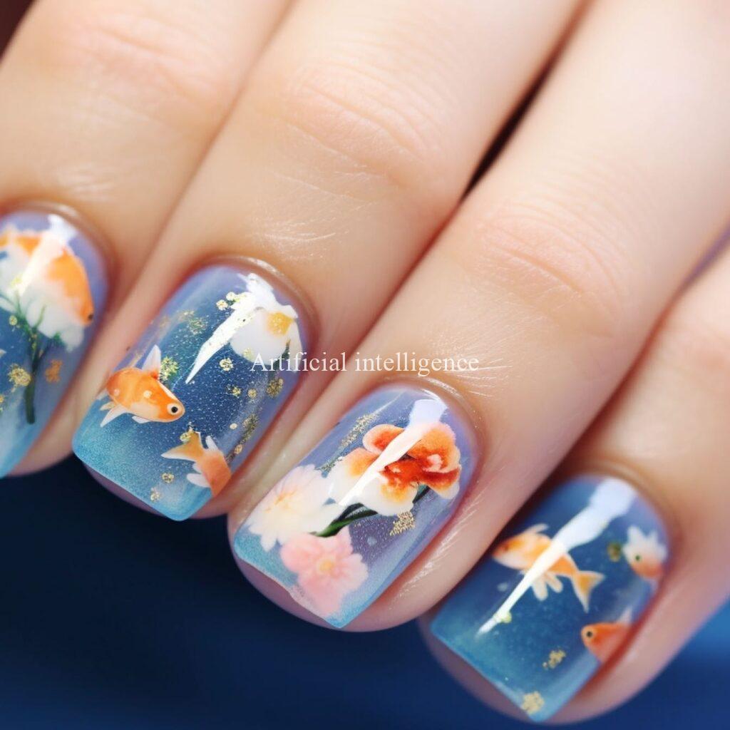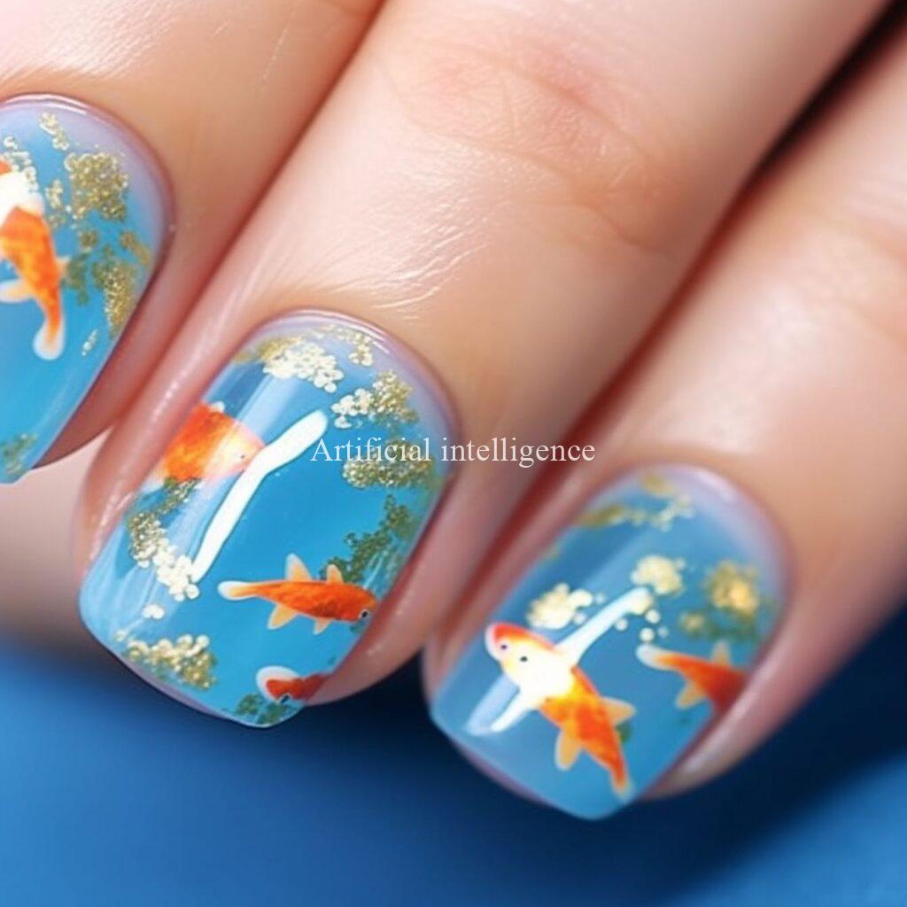 金魚鉢ネイル・鯉のネイルをコンセプトにAIイラストツールで架空の画像を生成しました。