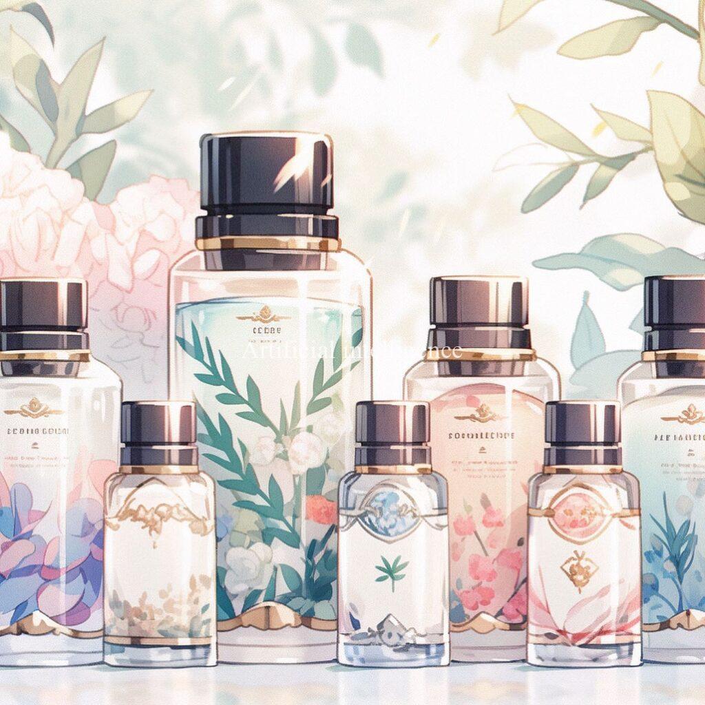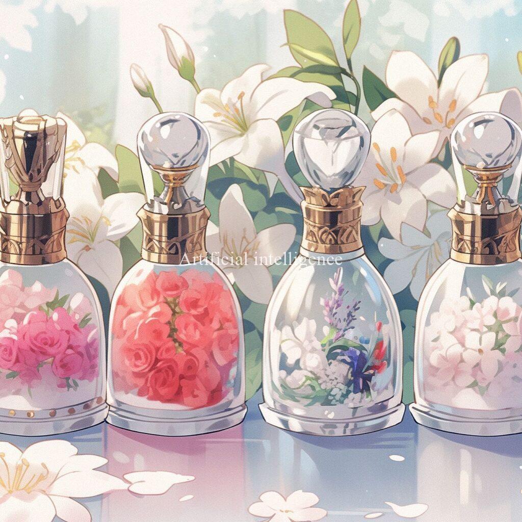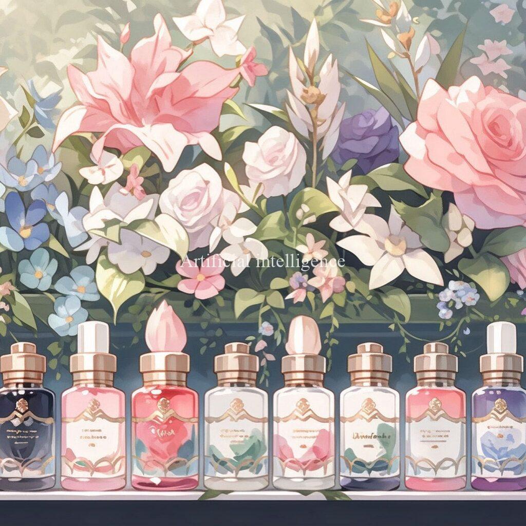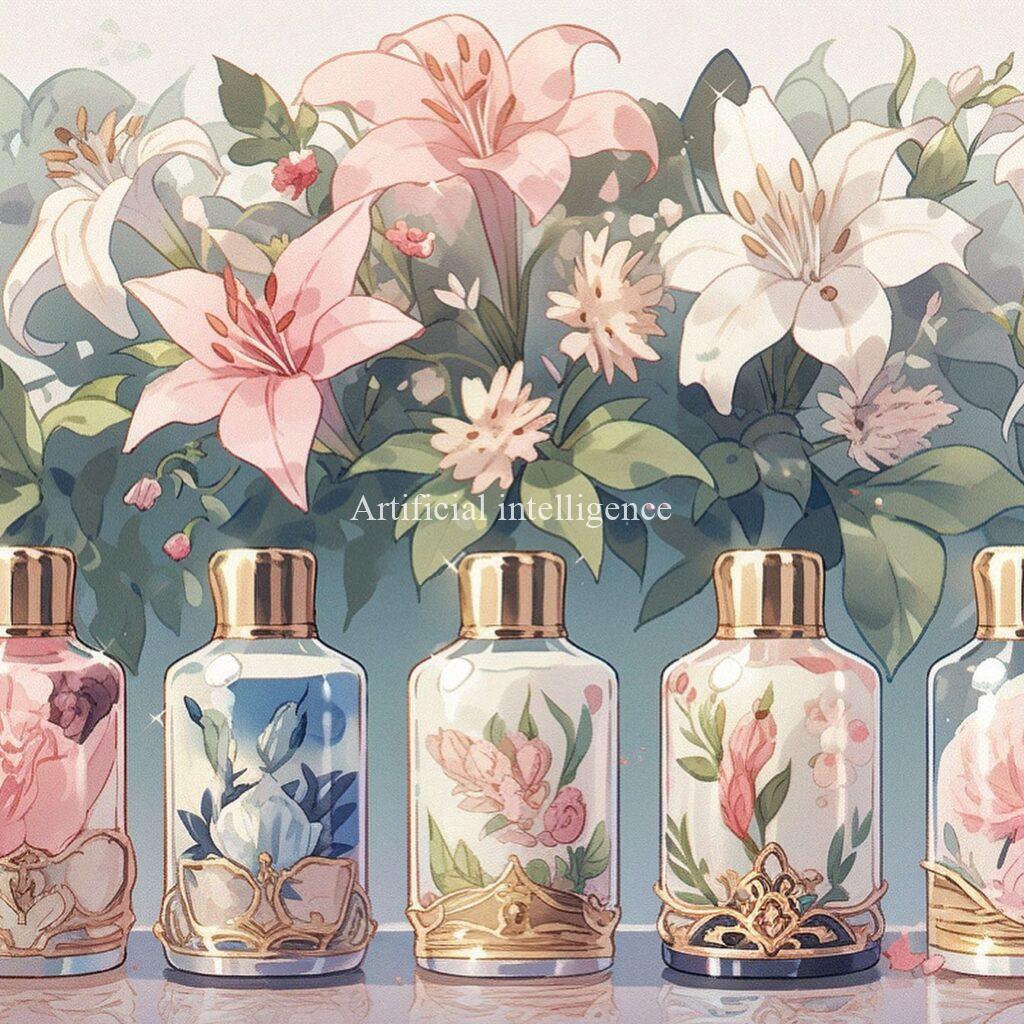 お花のネイルオイルとリムーバーのボトルをコンセプトにAIイラストツールで架空の画像を生成しました。