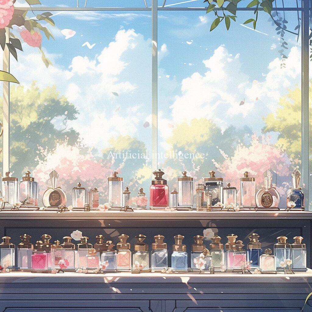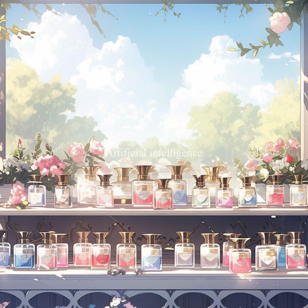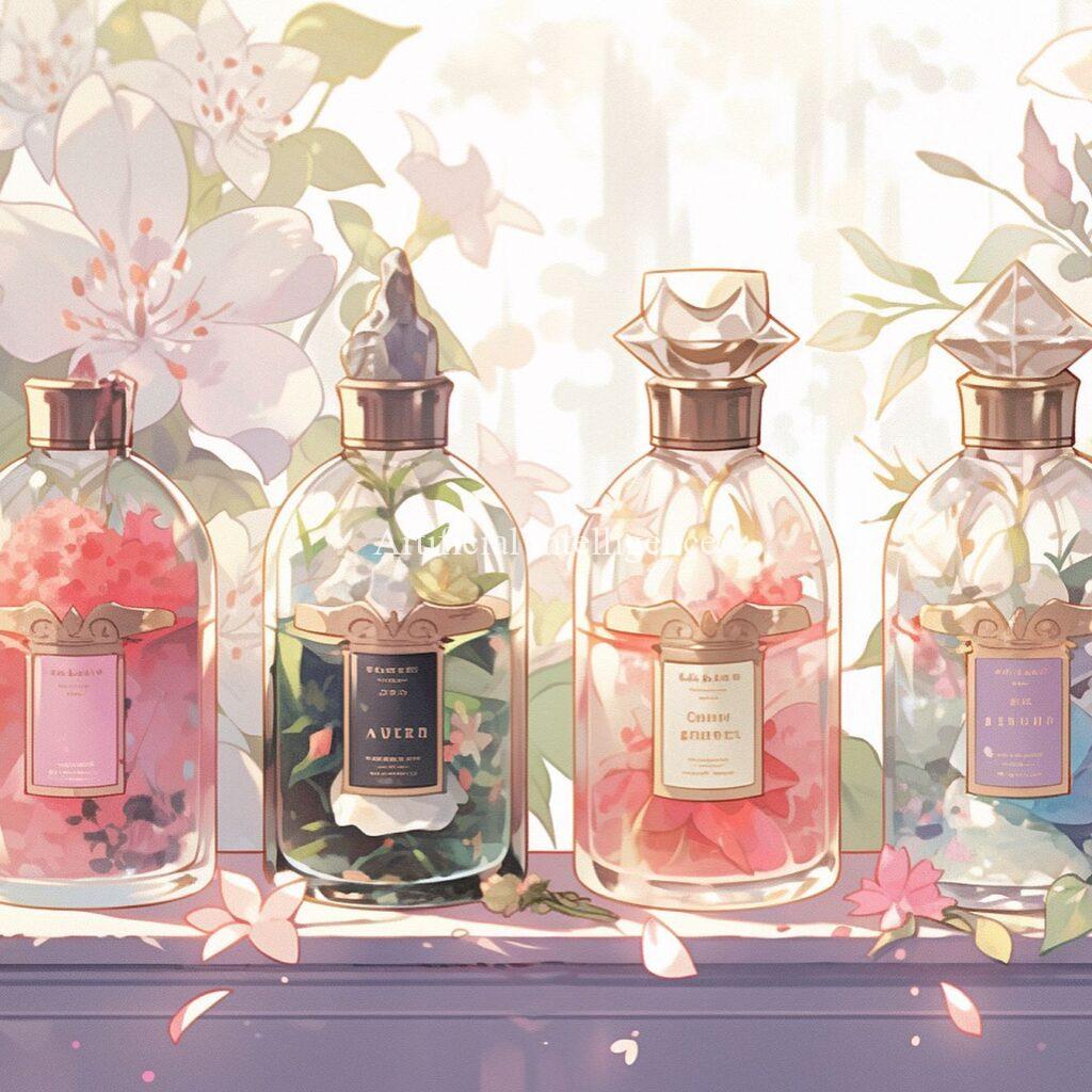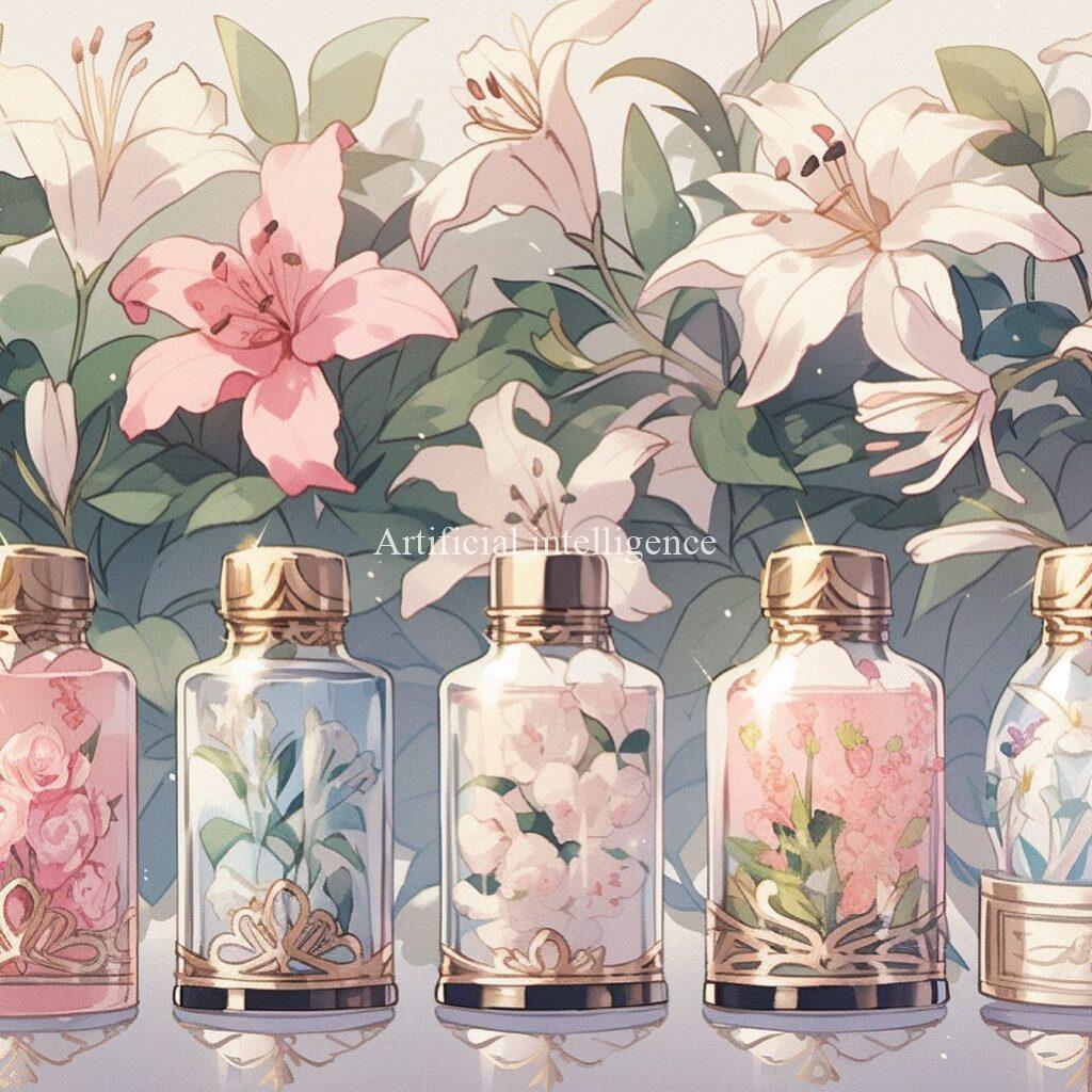 お花のネイルオイルとリムーバーのボトルをコンセプトにAIイラストツールで架空の画像を生成しました。