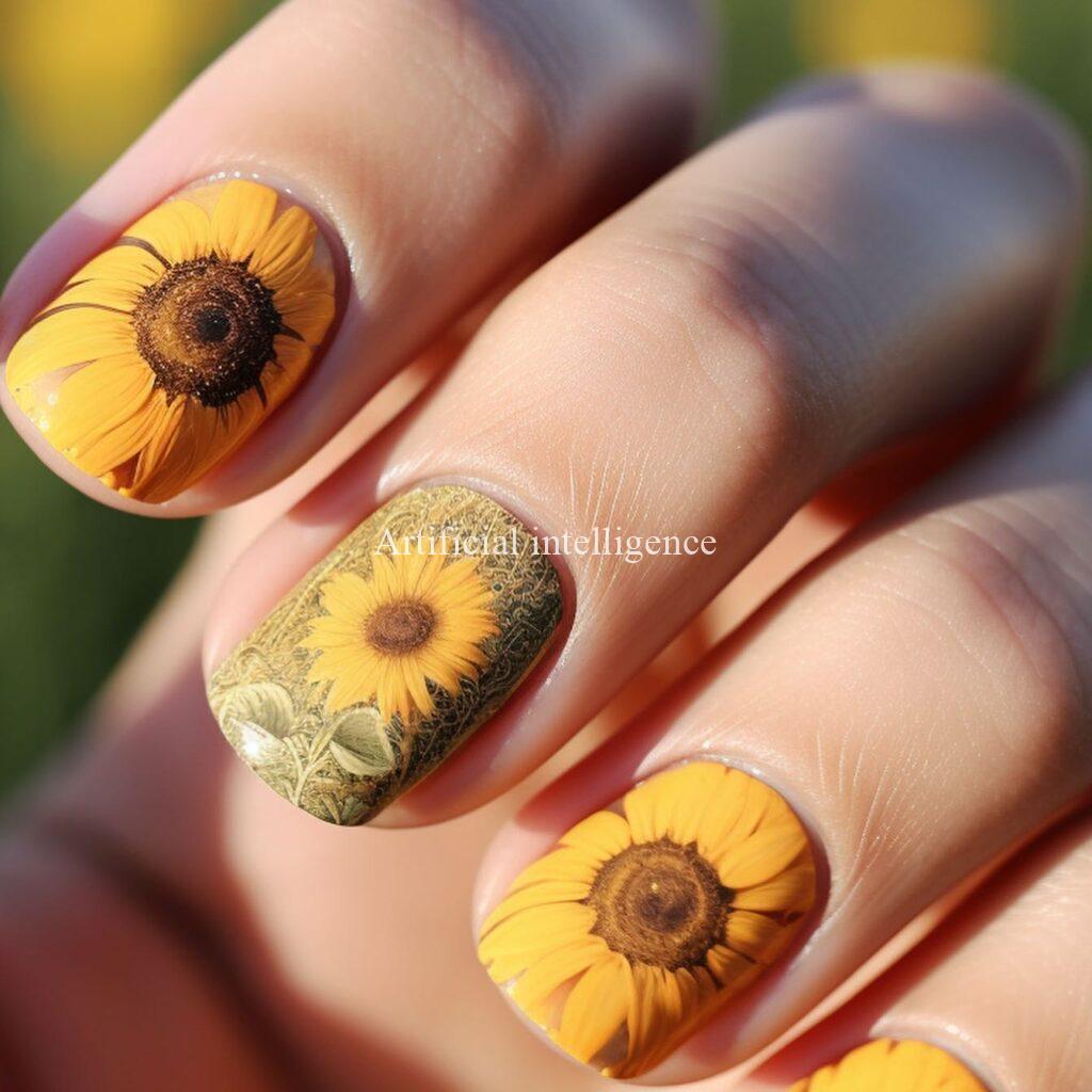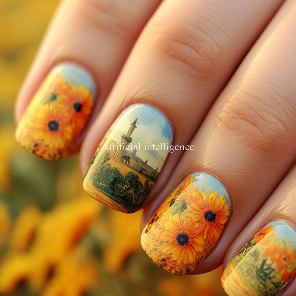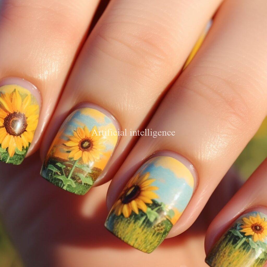 ひまわり畑の絵画風ネイルをコンセプトにAIイラストツールで架空の画像を生成しました。