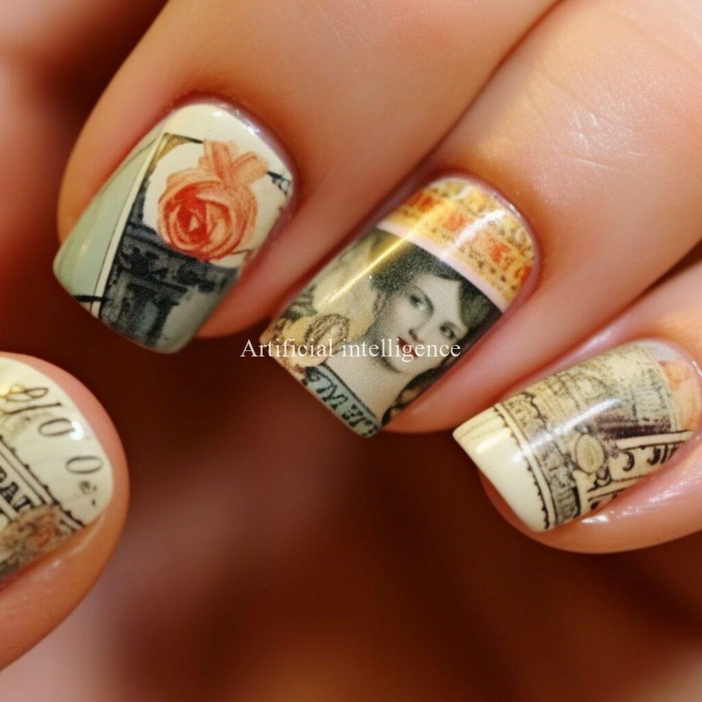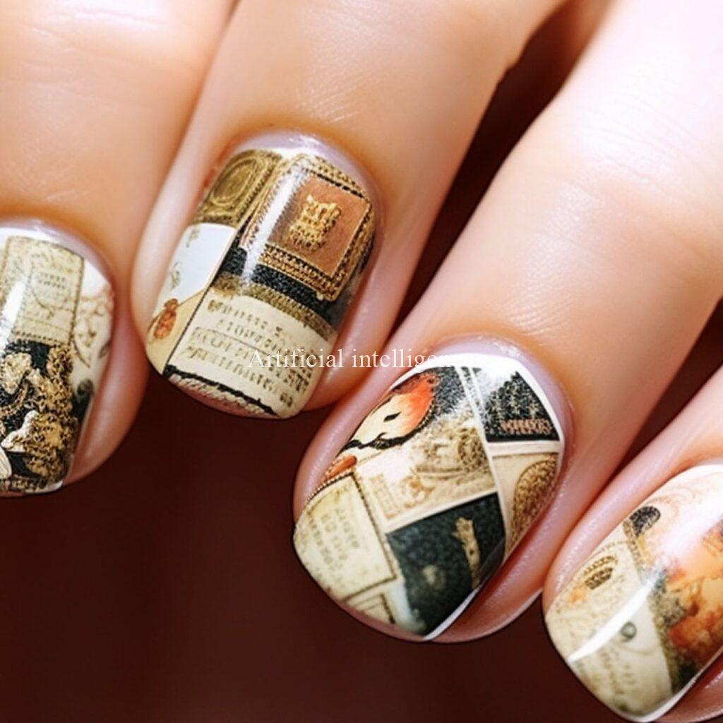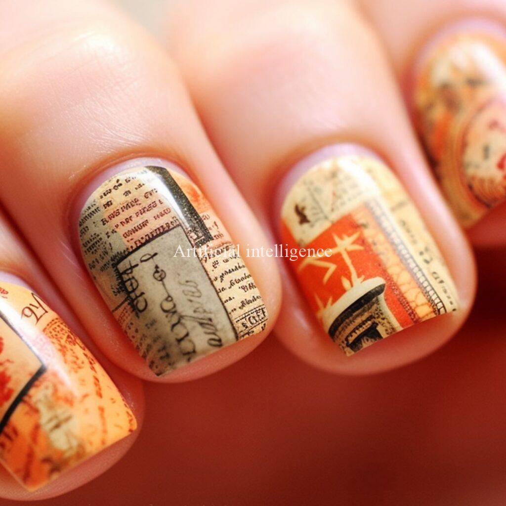レトロな英字新聞風ネイル 📰をコンセプトにAIイラストツールで架空の画像を生成しました。