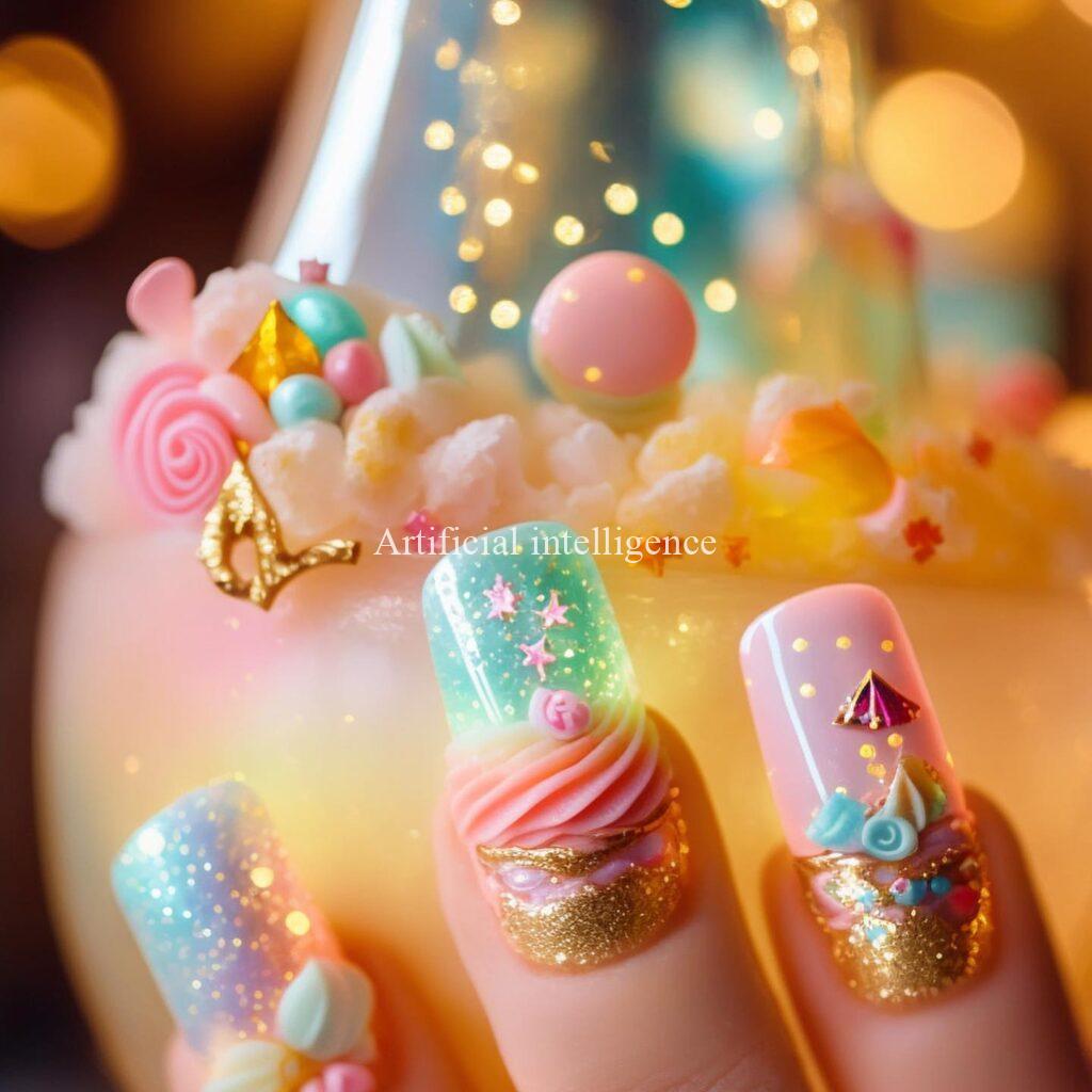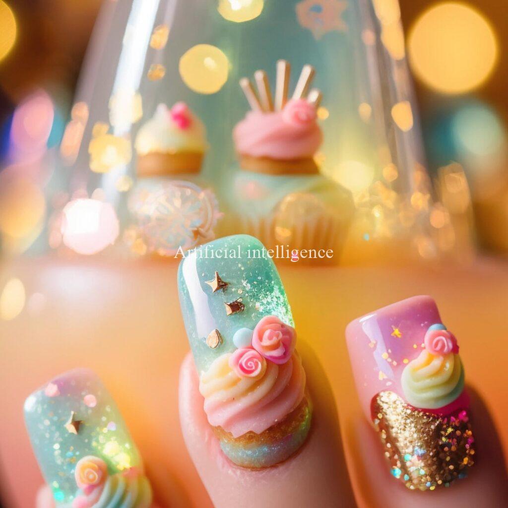 スイーツバイキングネイルをコンセプトにAIイラストツールで架空の画像を生成しました。