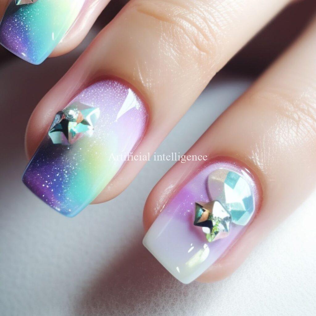 くすみレインボーネイルをコンセプトにAIイラストツールで架空の画像を生成しました。