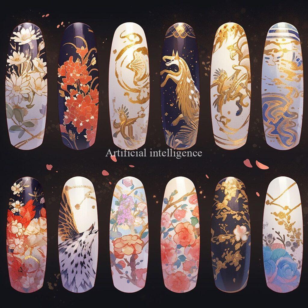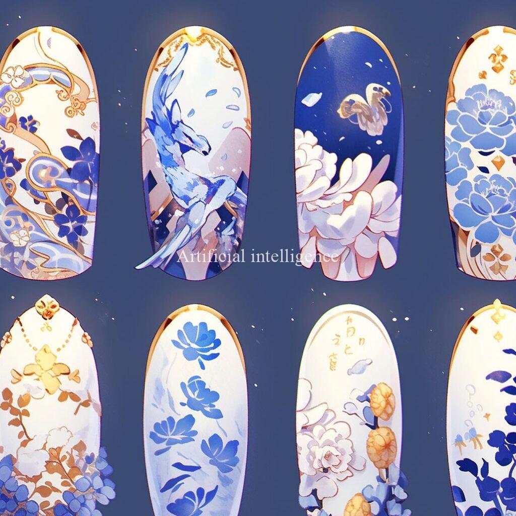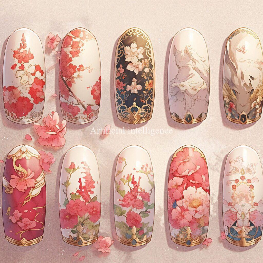 シノワズリ風ネイルチップのデザイン画をコンセプトにAIイラストツールで架空の画像を生成しました。