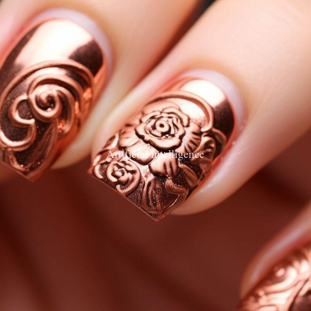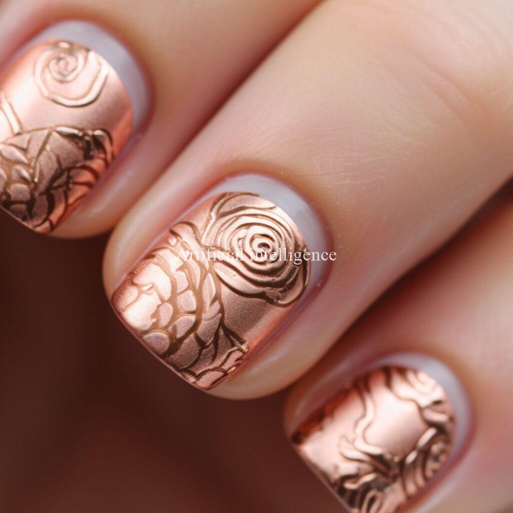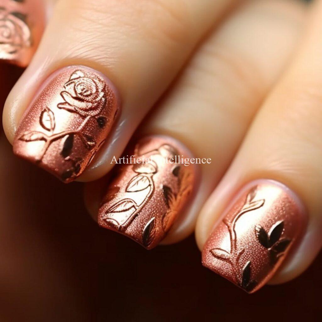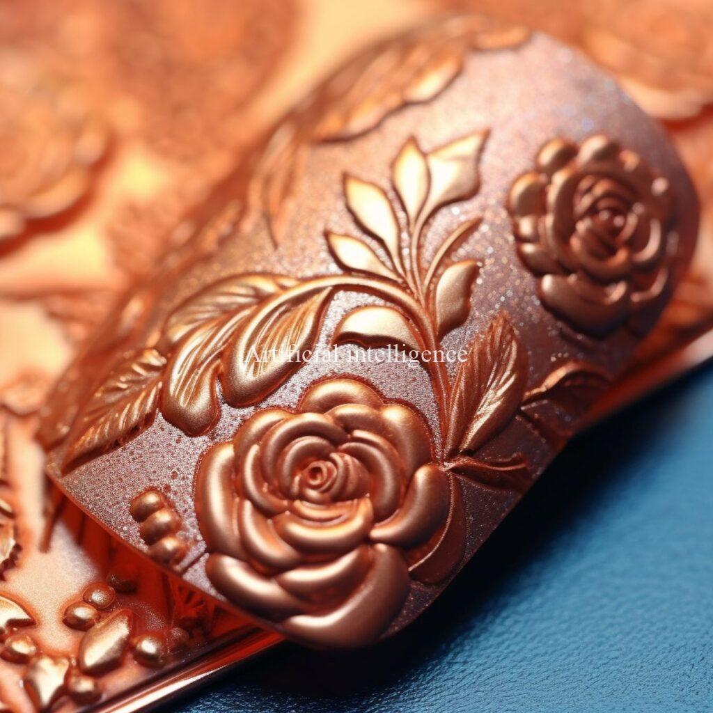 ピンクの銅板レリーフ風ネイルをコンセプトにAIイラストツールで架空の画像を生成しました。