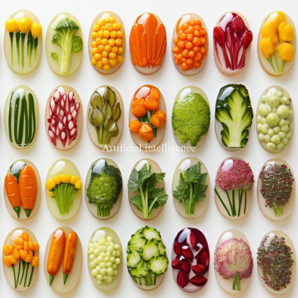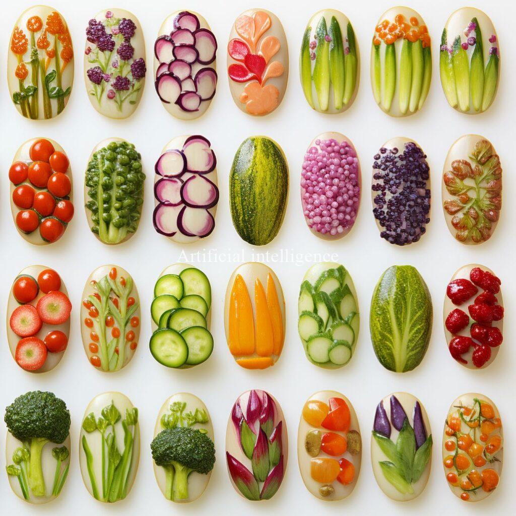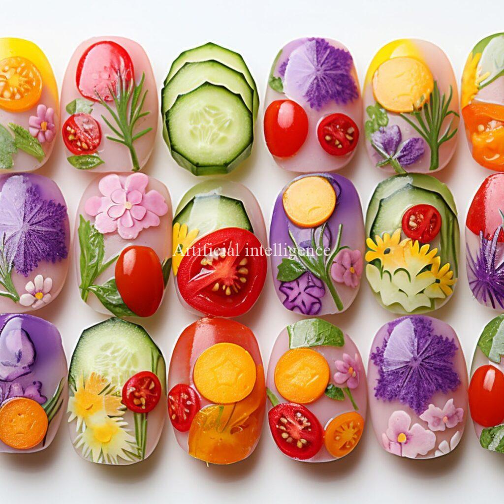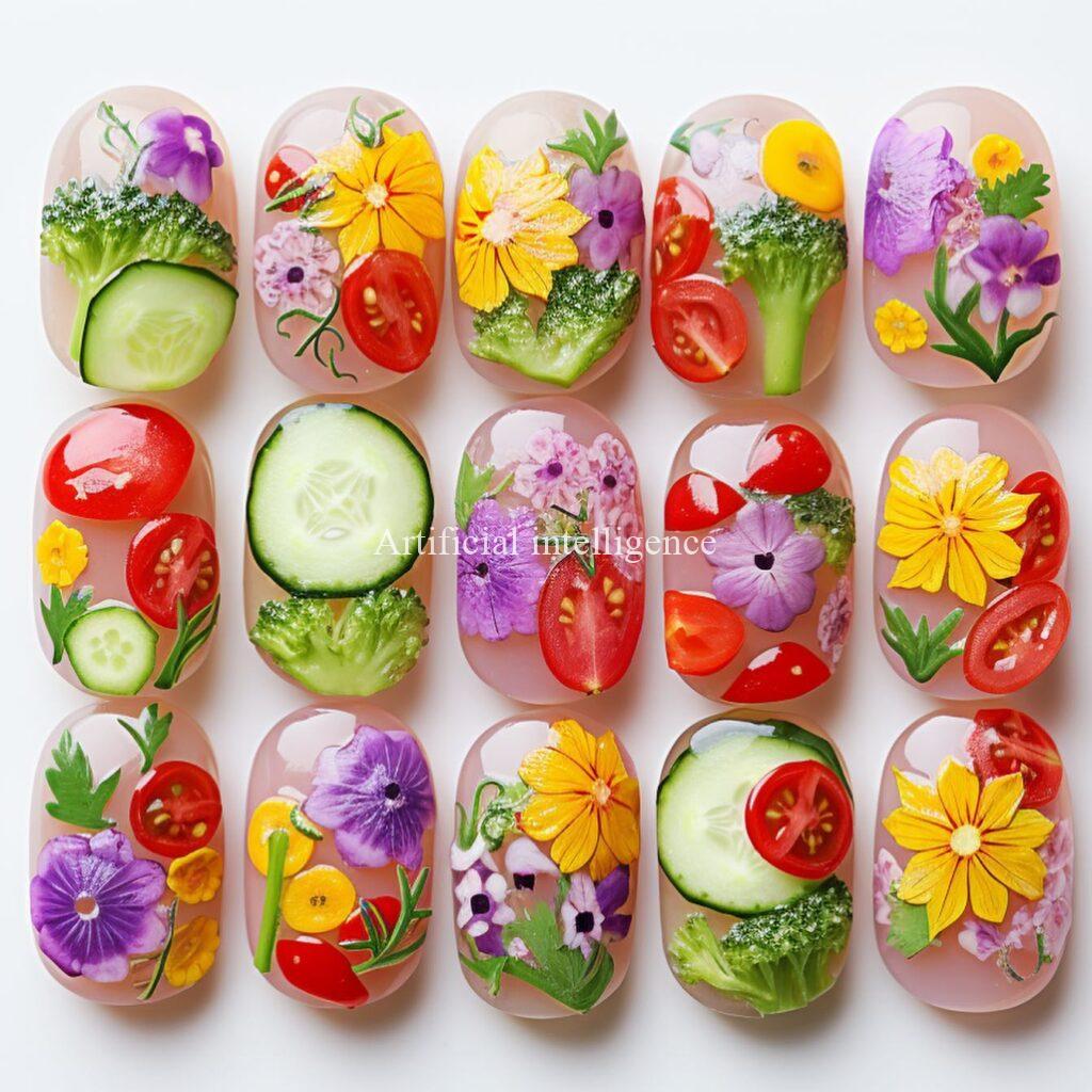 カラフルなお野菜ネイルチップ 🍅🥒🥕をコンセプトにAIイラストツールで架空の画像を生成しました。
