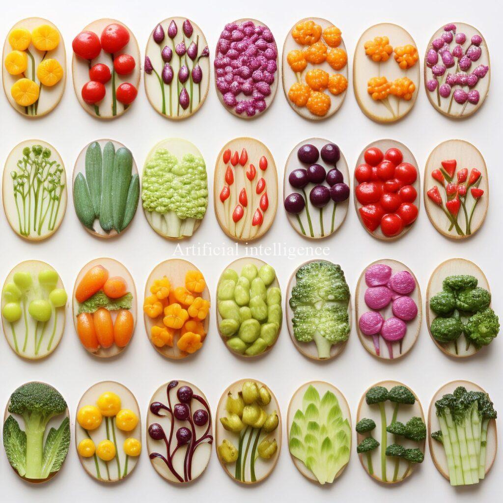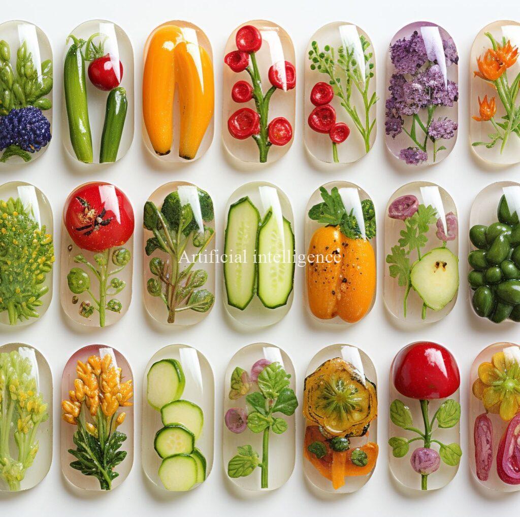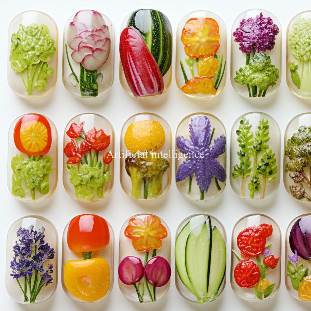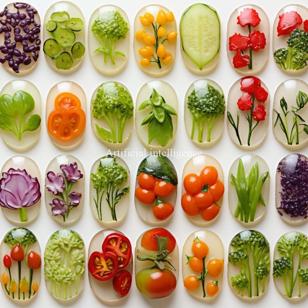 カラフルなお野菜ネイルチップ 🍅🥒🥕をコンセプトにAIイラストツールで架空の画像を生成しました。