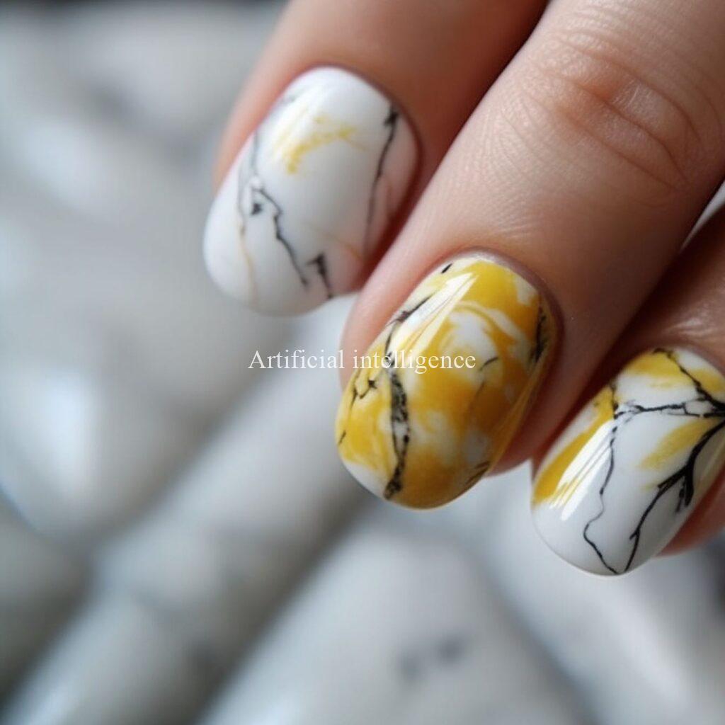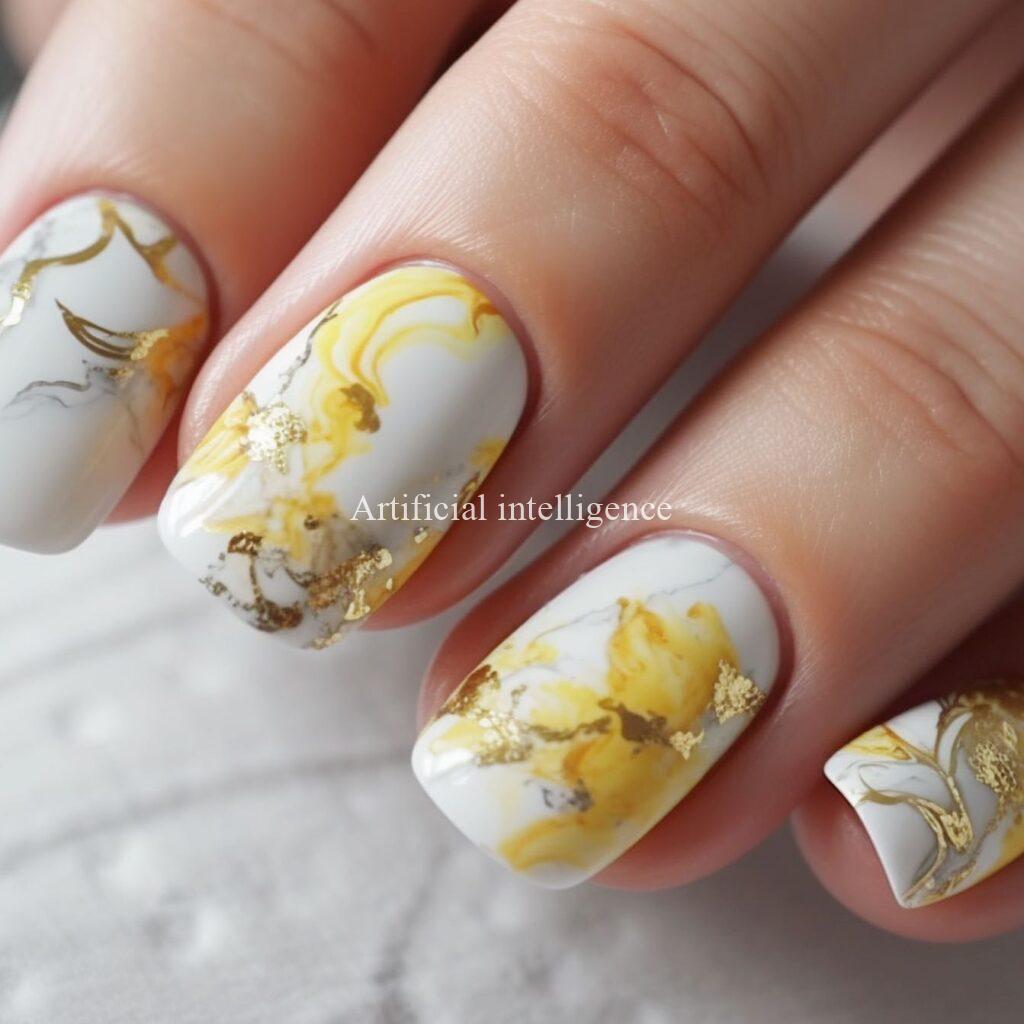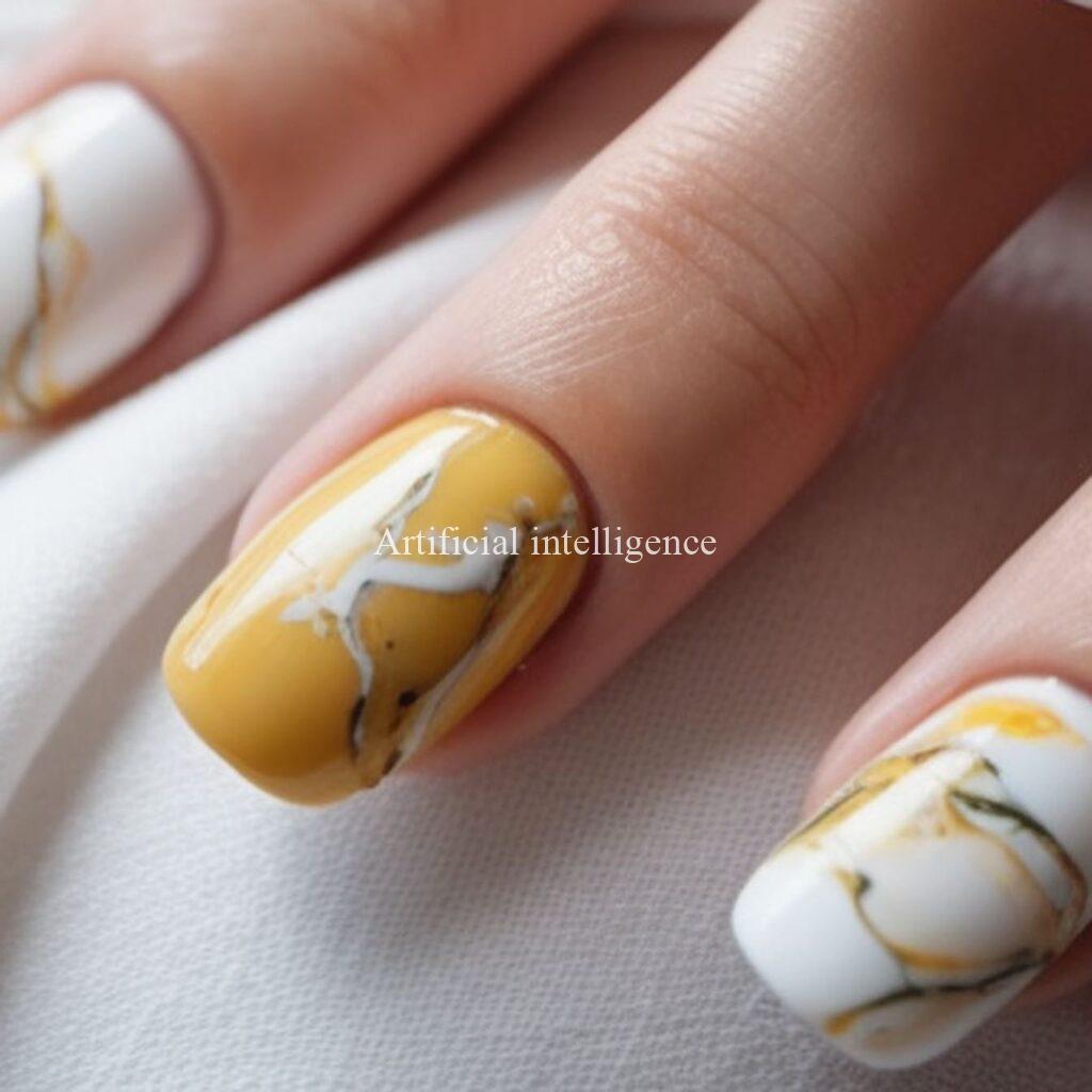 黄色ミックスの大理石ネイルをコンセプトにAIイラストツールで架空の画像を生成しました。