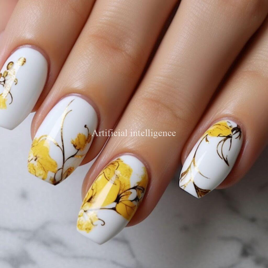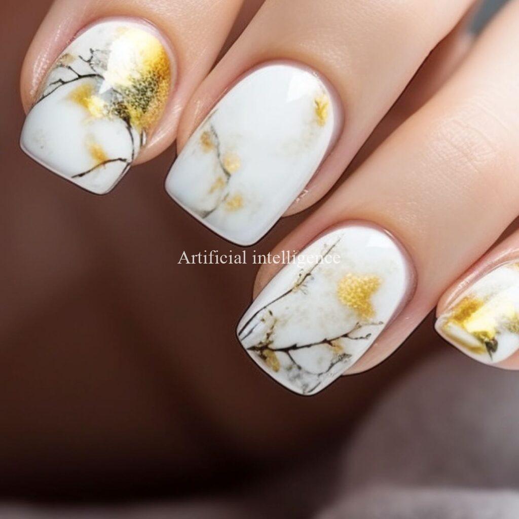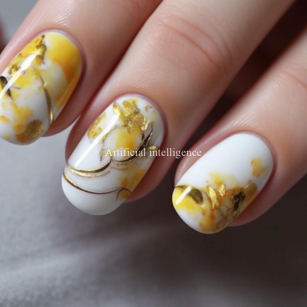黄色ミックスの大理石ネイルをコンセプトにAIイラストツールで架空の画像を生成しました。